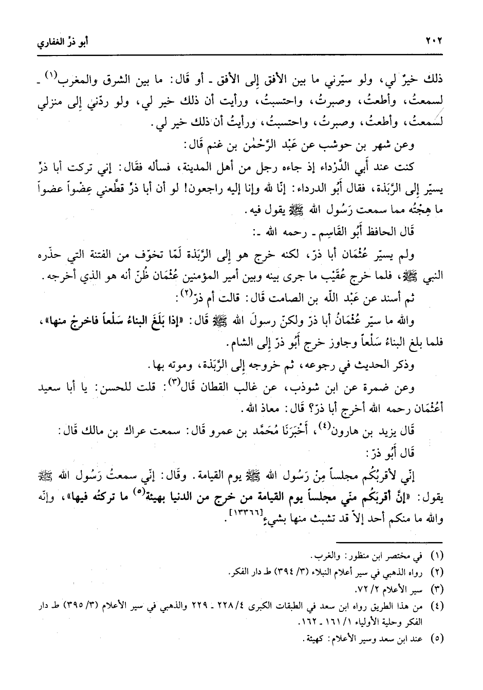 ذلك خبر لي ولو سيرني ما بين الأفق إلى الأفق أو قال ما بين المشرق والمغرب (1) لسمعت وأطعت وصبرت واحتسبت ورأيت أن ذلك خير لي ولو ردني إلى منزلي لسمعت وأطعت وصبرت واحتسبت ورأيت أن ورأيت أن ذلك خير لي وعن شهر بن حوشب عن عبد الرحمن بن غنم قال كنت عند أبي الدرداء إذ جاءه رجل من أهل المدينة فسأله فقال إني تركت أبا ذر يسير إلى الربذة فقال أبو الدرداء إنا لله وإنا إليه راجعون لو أن أبا ذر قطعني عضوا عضوا ما هجته مما سمعت رسول الله (صلى الله عليه وسلم) يقول فيه قال الحافظ أبو القاسم رحمه الله ولم يسير عثمان أبا ذر لكنه خرج هو إلى الربذة لما تخوف من الفتنة التي حذره النبي (صلى الله عليه وسلم) فلما خرج عقيب ما جرى بينه وبين أمير المؤمنين عثمان ظن أنه هو الذي أخرجه ثم أسند عن عبد الله بن الصامت قال قالت أم ذر (2) والله ما سير عثمان أبا ذر ولكن رسول الله (صلى الله عليه وسلم) قال إذا بلغ البناء سلعا فاخرج منها فلما بلغ البناء سلعا وجاوز خرج أبو ذر إلى الشام وذكر الحديث في رجوعه ثم خروجه إلى الربذة وموته بها وعن ضمرة عن ابن شوذب عن غالب القطان قال (3) قلت للحسن يا أبا سعيد أعثمان رحمه الله أخرج أبا ذر قال معاذ الله قال يزيد بن هارون (4) أخبرنا محمد بن عمرو قال سمعت عراك بن مالك قال قال أبو ذر أني لأقربكم مجلسا من رسول الله (صلى الله عليه وسلم) يوم القيامة وقال إني سمعت رسول الله (صلى الله عليه وسلم) يقول إن أقربكم مني مجلسا يوم القيامة من يخرج من الدنيا بهيئة (5) ما تركته فيها وإنه والله ما منكم أحد إلا قذ تشبث منها بشئ