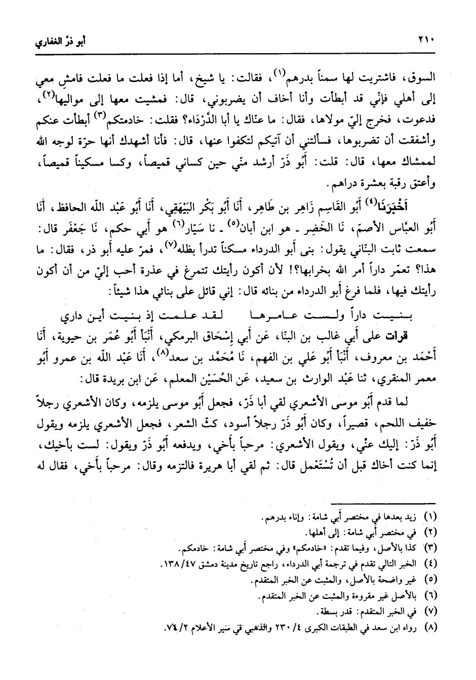 السوق فاشتريت لها سمنا بدرهم (1) فقالت يا شيخ أما إذا فعلت ما فعلت فامش معي إلى أهلي فإني قد أبطأت وأنا أخاف أن يضربوني قال فمشيت معها إلى مواليها (2) فدعوت فخرج إلي مولاها فقال ما عناك يا أبا الدرداء فقلت خادمتكم (3) أبطأت عنكم وأشفقت أن تضربوها فسألتني أن آتيكم لتكفوا عنها قال فأنا أشهد أنها حرة لوجه الله لممشاك معها قال قلت أبو ذر أرشد مني حين كساني قميصا وكسا مسكينا قميصا وأعتق رقبة بعشرة دراهم أخبرنا (4) أبو القاسم زاهر بن طاهر أنا أبو بكر البيهقي أنا أبو عبد الله الحافظ أنا أبو العباس الأصم نا الخضر هو ابن أبان (5) نا سيار (6) هو أبي حكم نا جعفر قال سمعت ثابت البناني يقول بنى أبو الدرداء مسكنا تدرأ بظله (7) فمر عليه أبو ذر فقال له ما هذا تعمر دارا أمر الله بخرابها لأن أكون رأيتك تتمرغ في عذرة أحب إلي من أن أكون رأيتك فيها فلما فرغ أبو الدرداء من بنائه قال إني قائل على بنائي هذا شيئا * بنيت دارا ولست عامرها * لقد علمت إذ بنيت أين داري * قرأت على أبي غالب بن البنا عن أبي إسحاق البرمكي أنبأ أبو عمر بن حيوية أنا أحمد بن معروف أنبأ أبو علي بن الفهم نا محمد بن سعد (8) أنا عبد الله بن عمرو أبو معمر المنقري ثنا عبد الوارث بن سعيد عن الحسين المعلم عن ابن بريدة قال لما قدم أبو موسى الأشعري لقي أبا ذر فجعل أبو موسى يلزمه وكان الأشعري رجلا خفيف اللحم وكان أبو ذر رجل أسود كث الشعر فجعل الأشعري يلزمه ويقول أبو ذر إليك عني ويقول الأشعري مرحبا بأخي ويدفعه أبو ذر ويقول لست بأخيك إنما كنت أخاك قبل أن تستعمل قال ثم لقي أبا هريرة فالتزمه وقال مرحبا بأخي فقال له