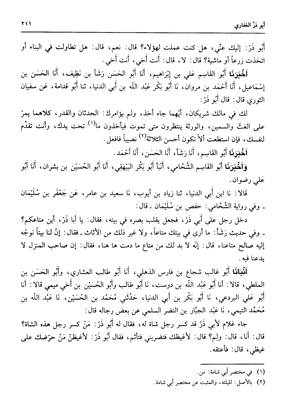 أبو ذر إليك عني هل كنت عملت لهؤلاء قال نعم قال هل تطاولت في البناء أو اتخذت زرعا أو ماشية قال لا قال أنت أخي أنت أخي أخبرنا أبو القاسم علي بن إبراهيم أنا أبو الحسن رشأ بن نظيف أنا الحسن بن إسماعيل أنا أحمد بن مروان نا أبو بكر عبد الله بن أبي الدنيا ثنا أبو قدامة عن سفيان الثوري قال قال أبو ذر لك في مالك شريكان أيهما جاء أخذ ولم يؤامرك الحدثان والقدر كلاهما يمر على الغث والسمين والورثة ينتظرون متى تموت فيأخذون ما (1) تحت يديك وأنت تقدم لنفسك فإن استطعت ألا تكون أحسن الثلاثة (2) نصيبا فافعل أخبرنا أبو القاسم أنا رشأ أنا الحسن أنا أحمد وأخبرنا أبو القاسم الشحامي أنبأ أبو بكر البيهقي أنا أبو الحسين بن بشران أنا أبو علي رضوان قالا نا أبي الدنيا ثنا زياد بن أيوب نا سعيد بن عامر عن جعفر بن سليمان وفي رواية الشحامي حفص بن سليمان قال دخل رجل على أبي ذر فجعل يقلب بصره في بيته فقال يا أبا ذر أين متاعكم وفي حديث رشأ ما أرى في بيتك متاعا ولا غير ذلك من الأثاث فقال إن لنا بيتا نوجه إليه صالح متاعنا قال إنه لا بد لك من متاع ما دمت ها هنا فقال إن صاحب المنزل لا يدعنا فيه أنبأنا أبو غالب شجاع بن فارس الذهلي أنا أبو طالب العشاري وأبو الحسن بن الملطي قالا أنا أبو عبد الله بن دوست نا أبو طالب وأبو الحسين بن أخي ميمي قالا أنا أبو علي البردعي نا أبو بكر بن أبي الدنيا ححدثني محمد بن الحسين نا عبد الله بن محمد التيمي نا عبد الجبار بن النضر السلمي عن بعض رجاله قال جاء غلام لأبي ذر قد كسر رجل شاة له فقال له أبو ذر من كسر رجل هذه الشاة قال أنا قال ولم قال لأغيظك فتضربني فتأثم فقال أبو ذر لأغيظن من حرضك على غيظي قال فأعتقه