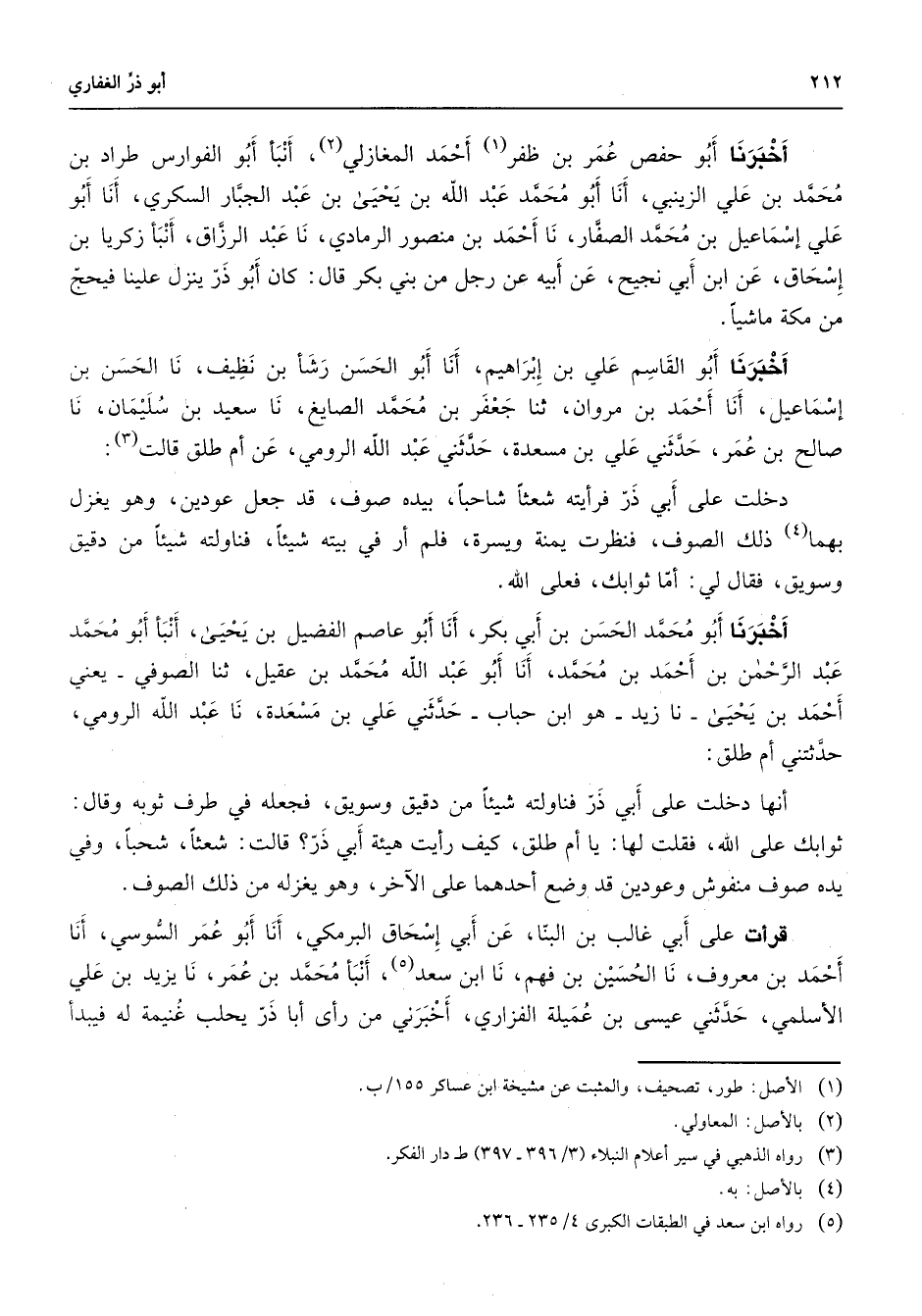 أخبرنا أبو حفص عمر بن ظفر (1) أحمد المغازلي (2) أنبأ أبو الفوارس طراد بن محمد بن علي الزينبي أنا أبو محمد عبد الله بن يحيى بن عبد الجبار السكري أنا أبو علي إسماعيل بن محمد الصفار نا أحمد بن منصور الرمادي نا عبد الرزاق أنبأ زكريا بن إسحاق عن ابن أبي نجيح عن أبيه عن رجل من بني بكر قال كان أبو بكر ينزل علينا فيحج من مكة ماشيا أخبرنا أبو القاسم علي بن إبراهيم أنا أبو الحسن رشأ بن نظيف نا الحسن بن إسماعيل أنا أحمد بن مروان ثنا جعفر بن محمد الصايغ نا سعيد بن سليمان نا صالح بن عمر حدثني علي بن مسعدة حدثني عبد الله الرومي عن أم مطلق قالت (3) أخبرنا أبو محمد الحسن بن أبي بكر أنا أبو عاصم الفضيل بن يحيى أنبأ أبو محمد عبد الرحمن بن أحمد بن محمد أنا أبو عبد الله محمد بن عقيل ثنا الصوفي يعني أحمد بن يحيى نا زيد هو ابن حباب حدثني علي بن مسعدة نا عبد الله الرومي حدثتني أم مطلق أنها دخلت على أبي ذر فناولته شيئا من دقيق وسويق فجعله في طرف ثوبه وقال ثوابك على الله فقلت لها يا أم طلق كيف رأيت هيئة أبي ذر قالت شعثا شحبا وفي يده صوف منفوش وعودين قد وضع أحدهما على الآخر وهو يغزله من ذلك الصوف قرأت على أبي غالب البنا عن أبي إسحاق البرمكي أنا أبو عمر السوسي أنا أحمد بن معروف نا الحسين بن فهم نا ابن سعد (5) أنبأ محمد بن عمر نا يزيد بن علي الأسلمي حدثني عيسى بن عميلة الفزاري أخبرني من رأى أبا ذر يحلب غنيمة له فيبدأ
