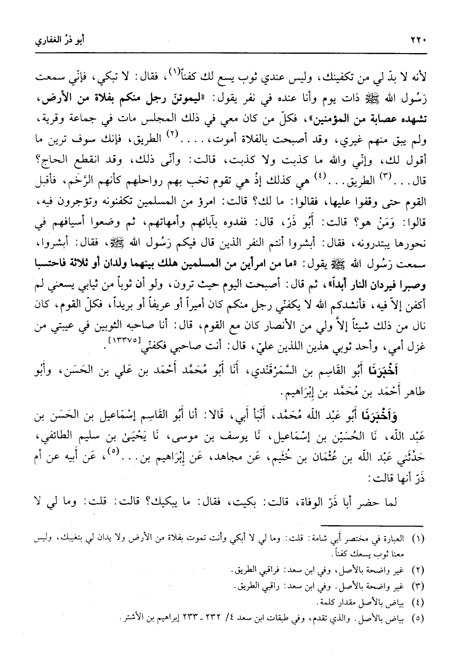 لأنه لا بد لي من تكفينك وليس عندي ثوب يسع لك كفنا (1) فقال لا تبكي فإني سمعت رسول الله (صلى الله عليه وسلم) ذات يوم يقول وأنا عنده في نفر يقول ليموتن رجل منكم بفلاة من الأرض تشهده عصابة من المؤمنين فكل من كان معي في ذلك المجلس مات في جماعة وقرية ولم يبق منهم غيري وقد أصبحت بالفلاة أموت (2) الطريق فإنك سوف ترين ما أقول لك وإني والله ما كذبت ولا كذبت قالت وأني ذلك وقد انقطع الحاج قال (3) الطريق (4) هي كذلك إذ هي تقوم تخب بهم رواحلهم كأنهم الرخم فأقبل القوم حتى وقفوا عليها فقالوا ما لك قالت امرؤ من المسلمين تكفنونه وتؤجرون فيه قالوا ومن هو قالت أبو ذر قال ففدوه بآبائهم وأمهاتهم ثم وضعوا أسيافهم في نحورها يبتدرونه فقال أبشروا أنتم النفر الذين قال فيكم رسول الله (صلى الله عليه وسلم) فقال أبشروا سمعت رسول الله (صلى الله عليه وسلم) يقول ما من امرأين من المسلمين هلك بينهما ولدان أو ثلاثة فاحتسبا وصبرا فيردان النار أبدا ثم قال أصبحت اليوم حيث ترون ولو أن ثوبا من ثيابي يسعني لم أكفن إلا فيه فأنشدكم الله لا يكفنني رجل منكم كان أميرا أو عريفا أو بريدا فكل القوم كان نال من ذلك شيئا إلا ولي من الأنصار كان مع القوم قال أنا صاحبه الثوبين في عيبتي من غزل أمي وأحد ثوبي هذين اللذين علي قال أنت صاحبي فكفني أخبرنا أبو القاسم بن السمرقندي أنا أبو محمد أحمد بن علي بن الحسن وأبو طاهر أحمد بن محمد بن إبراهيم وأخبرنا أبو عبد الله محمد أنبأ أبي قالا أنا أبو القاسم إسماعيل بن الحسن بن عبد الله نا الحسين بن إسماعيل نا يوسف بن موسى نا يحيى بن سليم الطائفي حدثني عبد الله بن عثمان بن خثيم عن مجاهد عن إبراهيم (5) عن أبيه عن أم ذر أنها قالت لما حضر أبا ذر الوفاة قالت بكيت فقال ما يبكيك قالت قلت وما لي لا