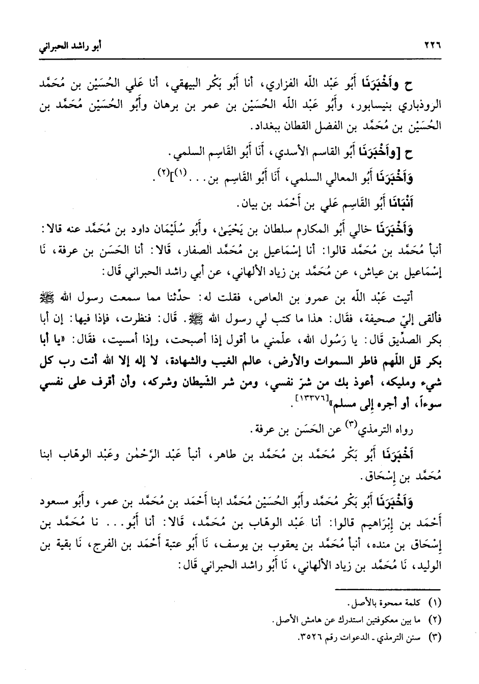 ح وأخبرنا أبو عبيد الله الفزاري أنا أبو بكر البيهقي أنا علي الحسين بن محمد الروذباري بنيسابور وأبو عبد الله الحسين بن عمر بن برهان وأبو الحسين محمد بن الحسين بن محمد بن الفضل القطان ببغداد ح وأخبرنا أبو القاسم الأسدي أنا أبو القاسم السلمي وأخبرنا أبو المعالي السلمي أنا أبو القاسم بن (1) (2) أنبأنا أبو القاسم علي بن أحمد بن بيان وأخبرنا خالي أبو المكارم سلطان بن يحيى وأبو سليمان داود بن محمد عنه قالا أنبأ محمد بن محمد قالوا أنا إسماعيل بن محمد الصفار قالا أنا الحسن بن عرفة نا إسماعيل بن عياش عن محمد بن زياد الألهاني عن أبي راشد الحبراني قال أتيت عبد الله بن عمرو بن العاص فقلت ت له حدثنا مما سمعت رسول الله (صلى الله عليه وسلم) فألقى إلي صحيفة فقال هذا ما كتب لي رسول الله (صلى الله عليه وسلم) قال فنظرت فإذا فيها إن أبا بكر الصديق قال يا رسول الله علمني ما أقول إذا أصبحت وإذا أمسيت فقال يا أبا بكر قل اللهم فاطر السموات والأرض عالم الغيب والشهادة لا إله إلا الله أنت رب كل شئ ومليكه أعوذ بك من شر نفسي ومن شر الشيطان وشركه وأن أقرف على نفسي سوءا أوأجره إلى مسلم رواه الترمذي (3) عن الحسن بن عرفة أخبرنا أبو بكر محمد بن محمد بن طاهر أنبأ عبد الرحمن وعبد الوهاب ابنا محمد بن إسحاق وأخبرنا أبو بكر محمد وأبو الحسين محمد ابنا أحمد بن محمد بن عمر وأبو مسعود أحمد بن إبراهيم قالوا أنا عبد الوهاب بن محمد قالا أنا أبو نا محمد بن إسحاق بن منده أنبأ محمد بن يعقوب بن يوسف نا أبو عتبة أحمد بن الفرج نا بقية بن الوليد نا محمد بن زياد الألهاني نا أبو راشد الحبراني قال