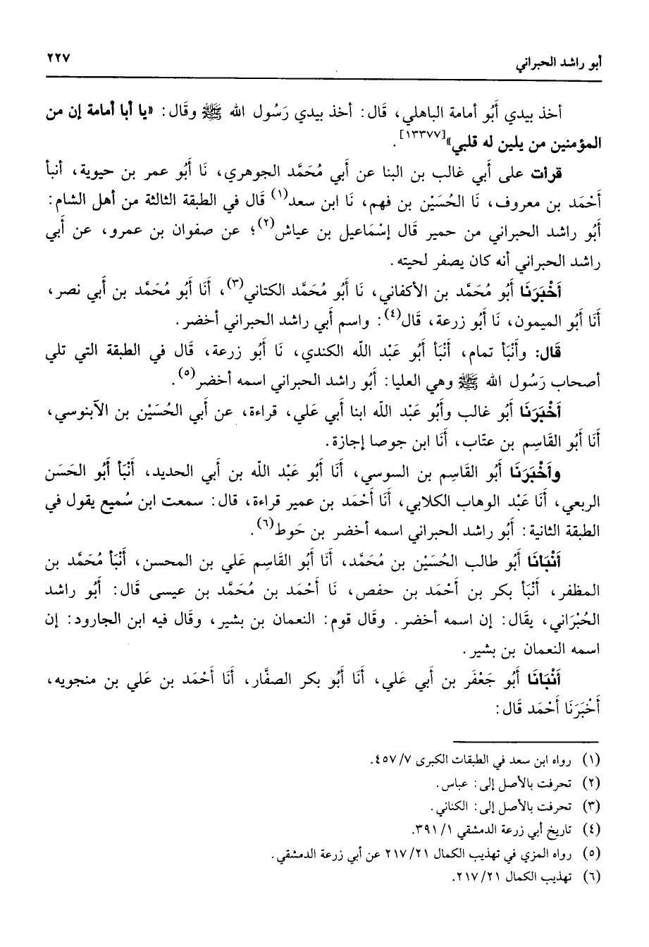 أخذ بيدي أبو أمامة الباهلي قال أخذ بيدي رسول الله (صلى الله عليه وسلم) وقال يا أبا أمامة إن من المؤمنين من يلين له قلبيح قرأت على أبي غالب بن البنا عن أبي محمد الجوهري نا أبو عمر بن حيوية أنبأ أحمد بن معروف نا الحسين بن فهم نا ابن سعد (1) قال في الطبقة الثالثة من أهل الشام أبو راشد الحبراني من حمير قال إسماعيل بن عياش (2) عن صفوان بن عمرو عن أبي راشد الحبراني أنه كان يصفر لحيته أخبرنا أبو محمد بن الأكفاني نا أبو محمد الكتاني (3) أنا أبو محمد بن أبي نصر أنا أبو الميمون نا أبو زرعة قال (4) واسم أبي راشد الحبراني أخضر قال وأنبأ تمام أنبأ أبو عبد الله الكندي نا أبو زرعة قال في الطبقة التي تلي أصحاب رسول الله (صلى الله عليه وسلم) وهي العليا أبو راشد الحبراني اسمه أخضر (5) أخبرنا أبو غالب وأبو عبد الله ابنا أبي علي قراءة عن أبي الحسين بن الآبنوسي أنا أبو القاسم بن عتاب أنا ابن جوصا إجازة وأخبرنا أبو القاسم بن السوسي أنا أبو عبد الله بن أبي الحديد أنبأ الحسن الربعي أنا عبد الوهاب الكلابي أنا أحمد بن عمير قراءة قال سمعت ابن سميع يقول في الطبقة الثانية أبو راشد الرحباني اسمه أخضر بن حوط (6) أنبأنا أبو طالب الحسين بن محمد أنا أبو القاسم علي بن المحسن أنبأ محمد بن المظفر أنبأ بكر بن أحمد بن حفص نا أحمد بن محمد بن عيسى قال أبو راشد الحبراني يقال إن اسمه أخضر وقال قوم النعمان بن بشير وقال فيه ابن الجارود إن اسمه النعمان بن بشير أنبأنا أبو جعفر بن أبي علي أنا أبو بكر الصفار أنا أحمد بن علي بن منجويه أخبرنا أحمد قال