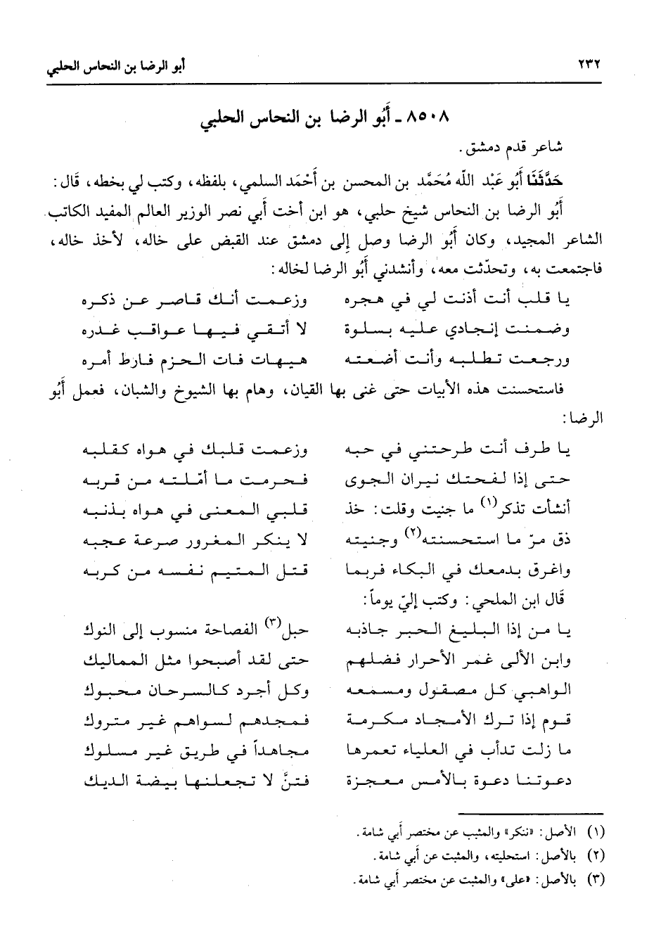 8508 - أبو الرضا بن النحاس الحلبي شاعر قدم دمشق حدثنا أبو عبد الله محمد بن الحسن بن أحمد السلمي بلفظه وكتب لي بخطه قال أبو الرضا بن النحاس شيخ حلبي هو ابن أخت أبي نصر الوزير العالم المفيد الكاتب الشاعر المجيد وكان أبو الرضا وصل إلى دمشق عند القبض على خاله لأخذ خاله فاجتمعت به وتحدثت معه وأنشدني أبو الرضا لخاله * يا قلب أنت أذنت لي في هجره * وزعمت أنك قاصر عن ذكره وضمنت إنجادي عليه بسلوة * لا أتقي فيها عواقب غدره ورجعت تطلبه وأنت أضعته * هيهات فات الحزم فارط أمره * فاستحسنت هذه الأبيات حتى غنى بها القيان وهام بها الشيوخ والشبان فعمل أبو الرضا * يا طرف أنت طرحتني في حبه * وزعمت قلبك في هواه كقلبه حتى إذا لفحتك نيران الجوى * فحرمت ما أملته من قربه أنشأت تذكر (1) ما جنيت وقلت خذ * قلبي المعني في هواه بذنبه ذق مر ما استحسنته (2) وجنيته * لا ينكر المغرور صرعة عجبه واغرق بدمعك في البكاء فربما * قتل المتيم نفسه من كربه * قال ابن الملحي وكتب إلي يوما * يا من إذا البليغ الحبر جاذبه * حبل (3) الفصاحة منسوب إلى النوك وابن الألى غمر الأحرار فضلهم * حتى لقد أصبحوا مثل المماليك الواهبي كل مصقول ومسمعه * وكل أجرد كالسرحان محبوك قوم إذا ترك الأمجاد مكرمة * فمجدهم لسواهم غير متروك ما زلت تدأب في العلياء تعمرها * مجاهدا في طريق غير مسلوك دعوتنا دعوة بالأمس معجزة * فتن لا تجعلنها بيضة الديك *