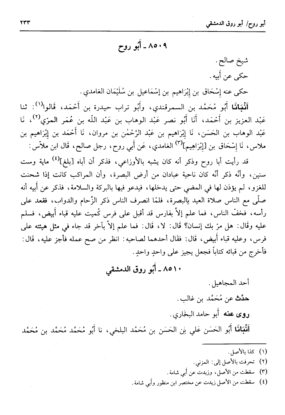 8510 - أبو روق الدمشقي أحد المجاهيل حدث عن محمد بن غالب روى عنه أبو حامد البخاري أنبأنا الحسن علي بن الحسن بن محمد البلخي نا أبو محمد محمد بن محمد