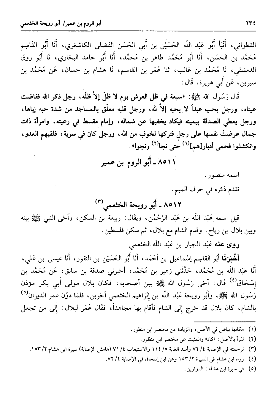 القطواني أنبأ أبو عبد الله الحسين بن أبي الحسن الفضلي الكاشغري أنا أبو القاسم محمد بن الحسن أنا أبو محمد طاهر بن محمد أنا أبو حامد البخاري نا أبو روق الدمشقي نا محمد بن غالب ثنا عمر بن القاسم نا هشام بن حسان عن محمد بن سيرين عن أبي هريرة قال قال رسول الله (صلى الله عليه وسلم) سبعة في ظل العرش يوم لا ظل إلا ظله رجل ذكر الله ففاضت عيناه ورجل يحب عبدا لا يحبه إلا لله ورجل قلبه معلق بالمساجد من شدة حبه إياها ورجل يعطي الصدقة بيمينه فيكاد يخفيها عن شماله وإمام مقسط في رعيته وامرأة ذات جمال عرضت نفسها على رجل فتركها لخوف من الله ورجل كان في سرية فلقيهم العدو وانكشفوا فحمى أدبارهم (1) حتى نجا (2) ونجوا