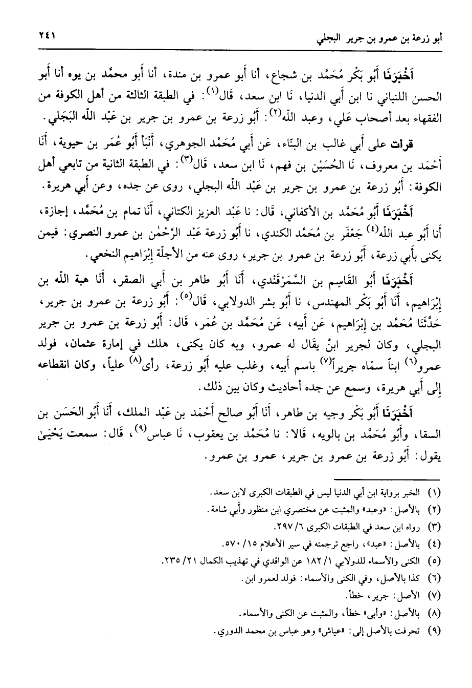 أخبرنا أبو بكر محمد بن شجاع أنا أبو عمرو بن مندة أنا أبو محمد بن يوه أنا أبو الحسن اللبناني نا ابن أبي الدنيا نا ابن سعد قال (1) في الطبقة الثالثة من أهل الكوفة من الفقهاء بعد أصحاب علي وعبد الله (2) أبو زرعة بن عمرو بن جرير بن عبد الله البجلي قرأت على أبي غالب بن البناء عن أبي محمد الجوهري أنبأ أبو عمر بن حيوية أنا أحمد بن معروف نا الحسين بن فهم نا ابن سعد قال (3) في الطبقة الثانية من تابعي أهل الكوفة أبو زرعة بن عمرو بن جرير بن عبد الله البجلي روى عن جده وعن أبي هريرة أخبرنا أبو محمد الأكفاني قال نا عبد العزيز الكتاني أنا تمام بن محمد إجازة أنا أبو عبد الله (4) جعفر بن محمد الكندي نا أبو زرعة عبد الرحمن بن عمرو النصري فيمن يكنى بأبي زرعة أبو زرعة بن عمرو بن جرير روى عنه من الأجلة إبراهيم النخعي أخبرنا أبو القاسم بن السمرقندي أنا أبو طاهر بن أبي الصقر أنا هبة الله بن إبراهيم أنا أبو بكر المهندس نا أبو بشر الدولابي قال (5) أبو زرعة بن عمرو بن جرير حدثنا محمد بن إبراهيم عن أبيه عن محمد بن عمر قال أبو زرعة بن عمرو بن جرير البجلي وكان لجرير ابن يقال له عمرو وبه كان يكنى هلك في امارة عثمان فولد عمرو (6) ابنا سماه جريرا (7) باسم أبيه وغلب عليه أبو زرعة رأى (8) عليا وكان انقطاعه إلى أبي هريرة وسمع عن جده أحاديث وكان بين ذلك أخبرنا أبو بكر وجيه بن طاهر أنا أبو صالح أحمد بن عبد الملك أنا أبو الحسن بن السقا وأبو محمد بن بالويه قالا نا محمد بن يعقوب نا عباس (9) قال سمعت يحيى يقول أبو زرعة بن عمرو بن جرير عمرو بن عمرو