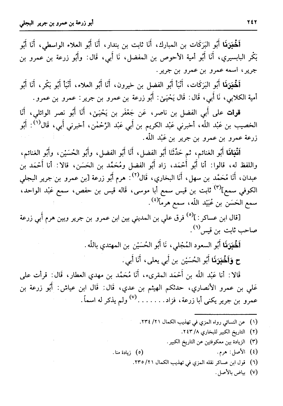 أخبرنا أبو البركات بن المبارك أنا ثابت بن بندار أنا أبو العلاء الواسطي أنا أبو بكر البابسيري أنا أبو أمية الأحوص بن المفضل نا أبي قال وأبو زرعة بن عمرو بن جرير اسمه عمرو بن عمرو بن جرير أخبرنا أبو البركات أنبأ أبو الفضل بن خيرون أنا أبو العلاء أنبأ أبو بكر أنا أبو أمية الكلابي نا أبي قال قال يحيى أبو زرعة بن عمرو بن جرير عمرو بن عمرو قرأت على أبي الفضل بن ناصر عن جعفر بن يحيى أنا أبو نصر الوائلي أنا الخصيب بن عبد الله أخبرني عبد الكريم بن أبي عبد الرحمن أخبرني أبي قال (1) أبو زرعة عمرو بن عمرو بن جرير بن عبد الله أنبأنا أبو الغنائم ثم حدثنا أبو الفضل أنا أبو الفضل وأبو الحسين وأبو الغنائم واللفظ له قالوا أنا أبو أحمد زاد أبو الفضل ومحمد بن الحسن قالا أنا أحمد بن عبدان أنا محمد بن سهل أنا البخاري قال (2) هرم أبو زرعة بن عمرو بن جرير البجلي الكوفي سمع (3) ثابت بن قيس سمع أبا موسى قاله قيس بن حفص سمع عبد الواحد سمع الحسن بن عبيد الله سمع هرما (4)
