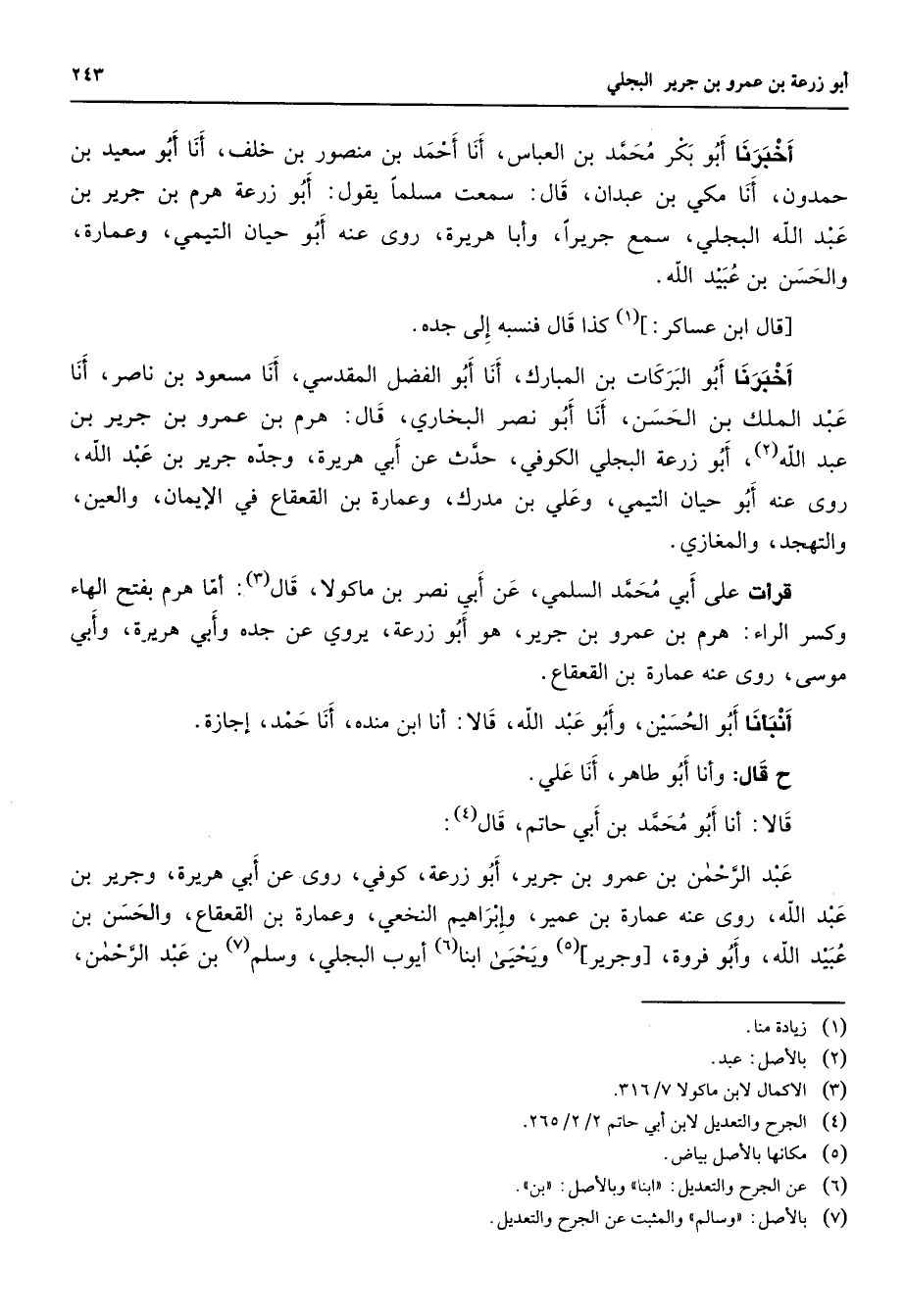 أخبرنا أبو بكر محمد بن العباس أنا محمد بن منصور بن خلف أنا أبو سعيد بن حمدون أنا مكي بن عبدان قال سمعت مسلما يقول أبو زرعة هرم بن جرير بن عبد الله البجلي سمع جريرا وأبا هريرة روى عنه أبو حيان التيمي وعمارة والحسن بن عبيد الله قال ابن عساكر (1) كذا قال فنسبه إلى جده أخبرنا أبو البركات بن المبارك أنا أبو الفضل المقدسي أنا مسعود بن ناصر أنا عبد الملك بن الحسن أنا أبو نصر البخاري قال هرم بن عمرو بن جرير بن عبد الله (2) أبو زرعة البجلي الكوفي حدث عن أبي هريرة وجده جرير بن عبد الله روى عنه أبو حيان التيمي وعلي بن مدرك وعمارة بن القعقاع في الإيمان والعين والتهجد والمغازي قرأت على أبي محمد السلمي عن أبي نصر بن ماكولا قال (3) أما هرم بفتح الهاء وكسر الراء هرم بن عمرو بن جرير هو أبو زرعة يروي عن جده وأبي هريرة وأبي موسى روى عنه عمارة بن القعقاع أنبأنا أبو الحسين وأبو عبد الله قالا أنا ابن منده أنا حمد إجازة ح قال وأنا أبو طاهر أنا علي قالا أنا أبو محمد بن أبي حاتم قال (4) عبد الرحمن بن عمرو بن جرير أبو زرعة كوفي روى عن أبي هريرة وجرير بن عبد الله روى عنه عمارة بن عمير وإبراهيم النخعي وعمارة بن القعقاع والحسن بن عبيد الله وأبو فروة وجرير (5) ويحيى ابنا (6) أيوب البجلي وسلم (7) بن عبد الرحمن