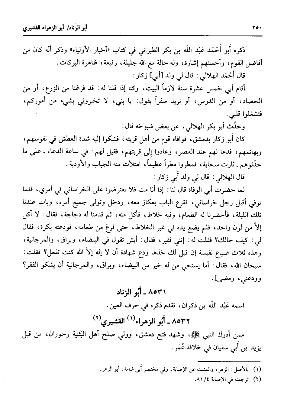 8532 - أبو الزهراء (1) القشيري (2) ممن أدرك النبي (صلى الله عليه وسلم) وشهد فتح دمشق وولي صلح أهل البثنية وحوران من قبل يزيد بن أبي سفيان في خلافة عمر