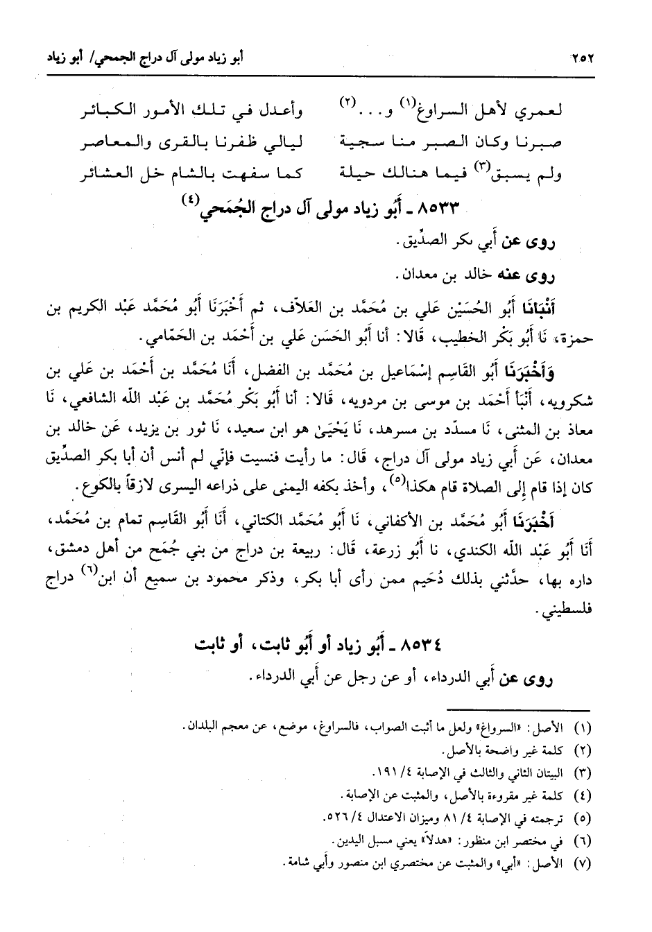 8533 - أبو زياد مولى آل دراج الجمحي (4) روى عن أبي بكر الصديق روى عنه خالد بن معدان أنبأنا أبو الحسين علي بن محمد بن العلاف ثم أخبرنا أبو محمد عبد الكريم بن حمزة نا أبو بكر الخطيب قالا أنا أبو الحسن علي بن أحمد بن الحمامي وأخبرنا أبو القاسم إسماعيل بن محمد بن الفضل أنا محمد بن أحمد بن علي بن شكرويه أنبأ أحمد بن موسى بن مردويه قالا أنا أبو بكر محمد بن عبد الله الشافعي نا معاذ بن المثنى نا مسدد بن مسرهد نا يحيى هو ابن سعيد نا ثور بن يزيد عن خالد بن معدان عن أبي زياد مولى آل دراج قال ما رأيت فنسيت فإني لم أنس أن أبا بكر الصديق كان إذا قام إلى الصلاة قام هكذا (5) وأخذ بكفه اليمنى على ذراعه اليسرى لازقا بالكوع أخبرنا أبو محمد بن الأكفاني نا أبو محمد الكتاني أنا أبو القاسم تمام بن محمد أنا أبو عبد الله الكندي نا أبو زرعة قال ربيعة بن دراج من بني جمح من أهل دمشق داره بها حدثني بذلك دحيم ممن رأى أبا بكر وذكر محمود بن سميع أن ابن (6) دراج فلسطيني