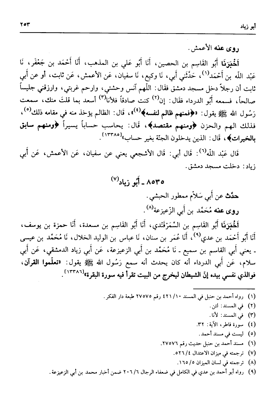 8535 - أبو زياد (7) جدث عن أبي سلام ممطور الحبشي روى عنه محمد بن أبي الزعيزعة (8) أخبرنا أبو القاسم بن السمرقندي أنا أبو القاسم بن مسعدة أنا حمزة بن يوسف أنا أبو أحمد بن عدي (9) أنا عمر بن سنان نا عباس بن الوليد الخلال نا محمد بن عيسى يعني أبي القاسم بن سميع نا محمد بن أبي الزعيزعة عن أبي زياد الدمشقي عن أبي سلام عن أبي الدرداء أنه كان يحدث أنه سمع رسول الله (صلى الله عليه وسلم) يقول تعلموا القرآن فوالذي نفسي بيده إن الشيطان ليخرج من البين تقرأ فيه سورة البقرة