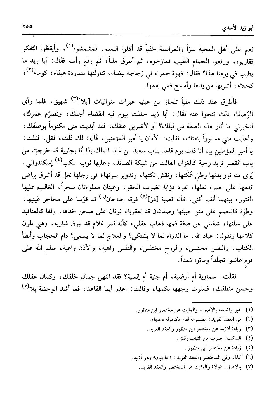 نعم على أهل المحبة سرا والمراسلة خفيا قد أكلوا النعيم فمشمشوه (1) وأيقظوا التفكر فقاربوه ورفعوا الحمام الطيب فمازجوه ثم أطرق مليا ثم رفع رأسه فقال أبا زيد ما يطيب في يومنا هذا فقال قهوة حمراء في زجاجة بيضاء تناولتها مقدودة هيفاء كوماء (2) كحلاء أشربها من يدها وأمسح فمي بفمها فأطرق عند ذلك مليا تنحاز من عينيه عبارات متواليات بلا (3) شهيق فلما رأى الوصفاء ذلك تنحوا عنه فقال أبا زيد حللت بيوم فيه انقضاء أجلك وتصرم عمرك لتخبرني ما أثار هذه الصفة من قبلك أو لأضربن عنقك فقد أبديت مني مكتوما بوصفك وأعليت مني مستورا بنعتك فقلت الأمان يا أمير المؤمنين قال لك ذلك فقل فقلت يا أمير المؤمنين بينا أنا ذات يوم قاعد بباب سعيد بن عبد الملك إذا أنا بجارية قد خرجت من باب القصر تريد رحبة كالغزال الفالت من شبكة الصائد وعليها ثوب سكب (4) إسكندراني يرى منه نور بدنها وطى عكنها ونقش تكتها وتدوير سرتها في رجلها نعل قد أشرق بياض قدمها على حمرة نعلها تفرد ذؤابة تضرب الحقو وعينان مملوءتان سحرا الغالب عليها الفتور بينهما أنف أقنى كأنه قصب در (5) فوقه جناحان (6) قد قوسا على محاجر عينيها وطرة كالحمم على متن جبينها وصدغان قد تعقربا نونان على صحن خدها وقفا كالعناقيد على سلتها شغلني عن صفة فمها ذهاب عقلي كأنه قمر غلام قد تبرق شاربه وهي تلون كلامها وتقول عباد الله ما الدواء لما لا يشتكي والعلاج لما لا يسمى دام الحجاب وأبطأ الكتاب والنفس محتبس والروح مختلس والنفس واهية والأذن واعية سلم الله على قوم عاشوا تجلدا وماتوا كمدا فقلت سماوية أم أرضية أم جنية أم أنسية فقد انتهى جمال خلقك وكمال عقلك وحسن منطقك فسترت وجهها بكمها وقالت اعذر أيها القاعد فما أشد الوحشة بلا (7)
