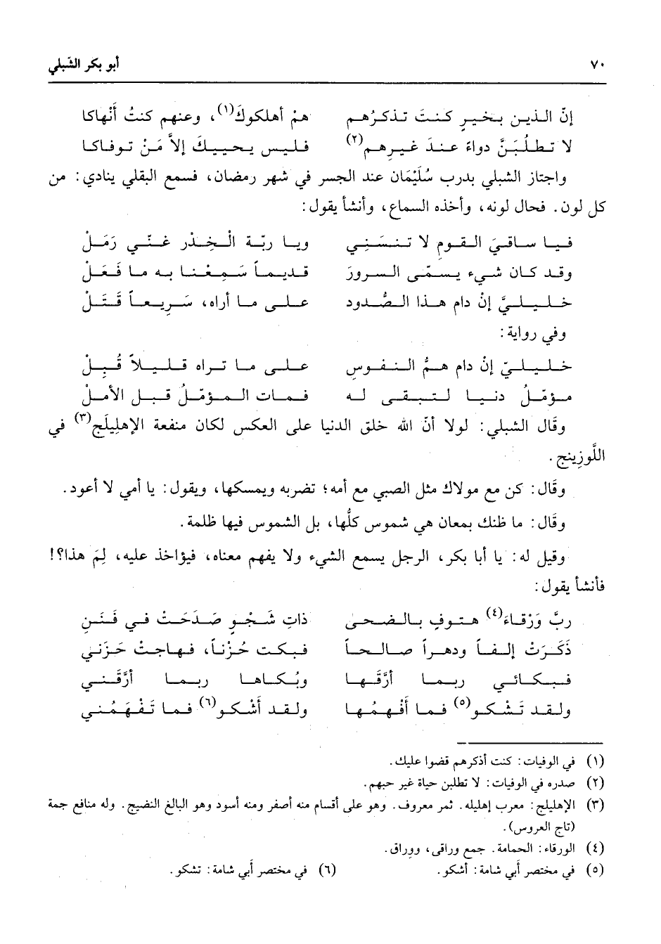 * إن الذين بخير كنت تذكرهم * هم أهلكوك (1) وعنهم كنت أنهاكا لا نطلبن دواء عند غيرهم (2) * فليس يحييك إلا من توفاكا * واجتاز الشبلي بدرب سليمان عند الجسر في شهر رمضان فسمع البقلي ينادي من كل لون فحال لونه وأخذه السماع وأنشأ يقول * فيا ساقي القوم لا تنسني * ويا ربة الحدر غني رمل وقد كان شئ يسمى السرور * قديما سمعنا به ما فعل خليلي إن دام هذا الصدود * على ما أراه سريعا قتل * وفي رواية * خليلي إن دام هم النفوس * على ما تراه قليلا قبل مؤمل دنيا لتبقى له * فمات المؤمل قبل الأمل * وقال الشبلي لولا أن الله خلق الدنيا على العكس لكان منفعة الإهليلج (3) في اللوزينج وقال كن مع مولاك مثل الصبي مع أمه تضربه ويمسكها ويقول يا أمي لاأعود وقال ما ظنك بمعان هي شموس كلها بل الشموس فيها ظلمة وقيل له يا أبا بكر الرجل يسمع الشئ ولا يفهم معناه فيؤاخذ عليه لم هذا فأنشأ يقول * رب ورقاء (4) هتوف بالضحى * ذات شجو صدحت في فنن ذكرت إلفا ودهرا صالحا * فبكت حزنا فهاجت حزني فبكائي ربما أرقها * وبكاها ربما أرقني ولقد تشكو (5) فما أفهمها * ولقد أشكو (6) فما تفهمني