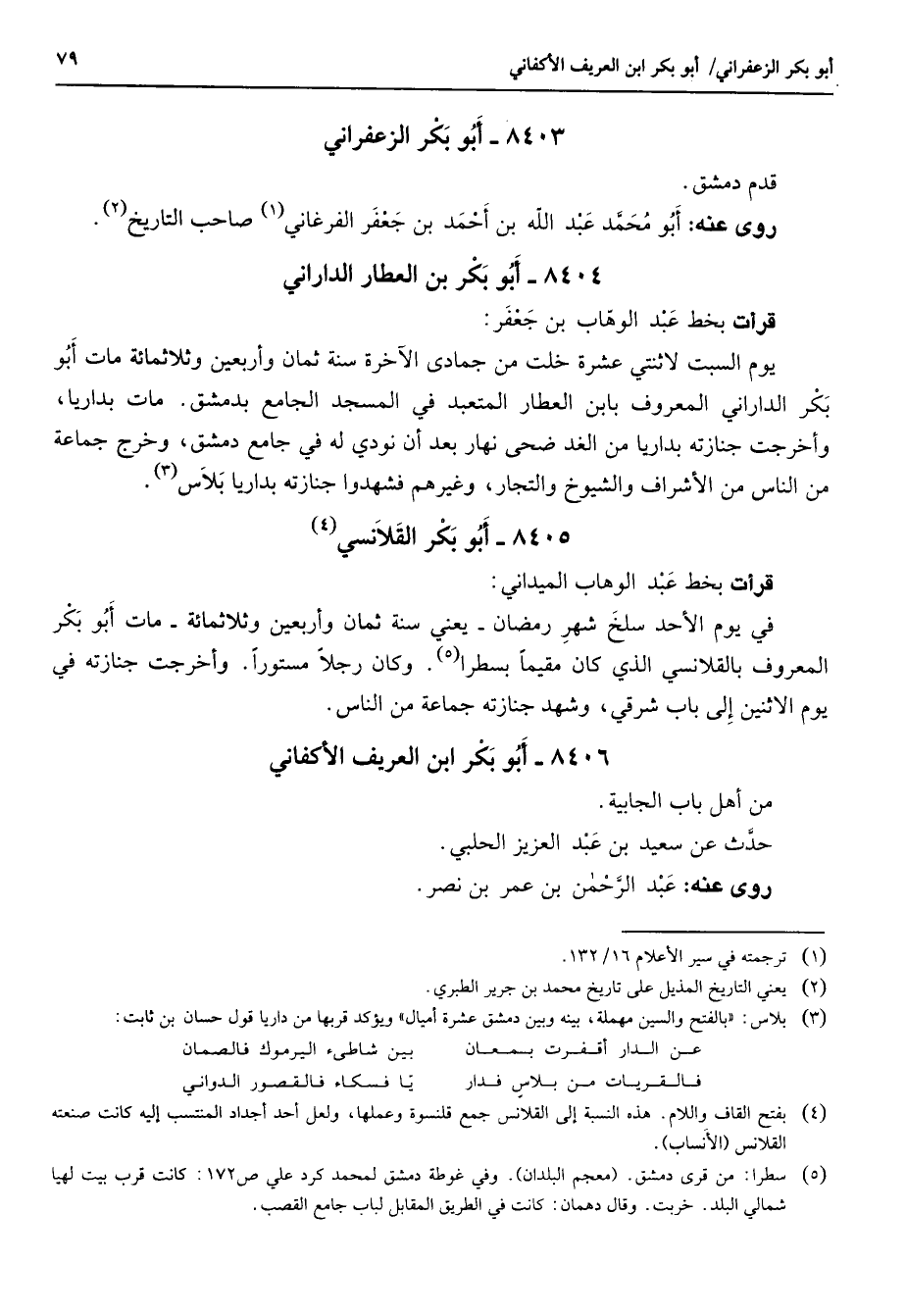 8405 - أبو بكر القلانسي (4) قرأت بخط عبد الوهاب الميداني في يوم الأحد سلخ شهر رمضان يعني سنة ثمان وأربعين وثلاثمائة مات أبو بكر المعروف بالقلانسي الذي كان مقيما بسطرا (5) وكان رجلا مستورا وأخرجت جنازته في يوم الاثنين إلى باب شرقي وشهد جنازته جماعة من الناس