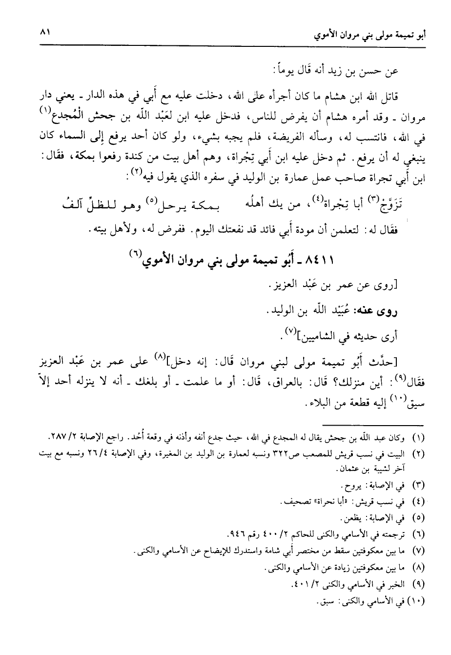 8411 - أبو تميمة مولى بني مروان الأموي (6) روى عن عمر بن عبد العزيز روى عنه عبيد الله بن الوليد أرى حديثه في الشاميين (7) حدث أبو تميمة مولى لبني مروان قال إنه دخل (8) على عمر بن عبد العزيز فقال (9) أين منزلك قال بالعراق قال أو ما علمت أو بلغك أنه لا ينزله أحد إلا سيق (10) إليه قطعة من البلاء