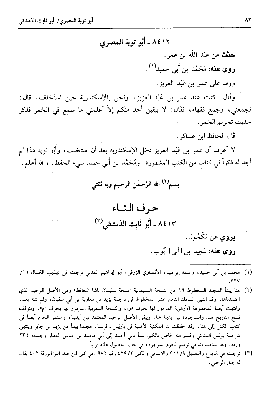 8412 - أبو توبة المصري حدث عن عبد الله بن عمر روى عنه محمد بن أبي حميد (1) ووفد على عمر بن عبد العزيز وقال كنت عند عمر بن عبد العزيز ونحن بالإسكندرية حين استخلف قال فجمعني وجمع فقهاء فقال لا يبقين أحد منكم إلا أعلمني ما سمع في الخمر فذكر حديث تحريم الخمر قال الحافظ ابن عساكر لا أعرف أن عمر بن عبد العزيز دخل الإسكندرية بعد أن استخلف وأبو توبة هذا لم أجد له ذكرا في كتاب من الكتب المشهورة ومحمد بن أبي حميد سئ الحفظ والله أعلم بسم (2) الله الرحمن الرحيم وبه ثقتي " حرف الثاء "