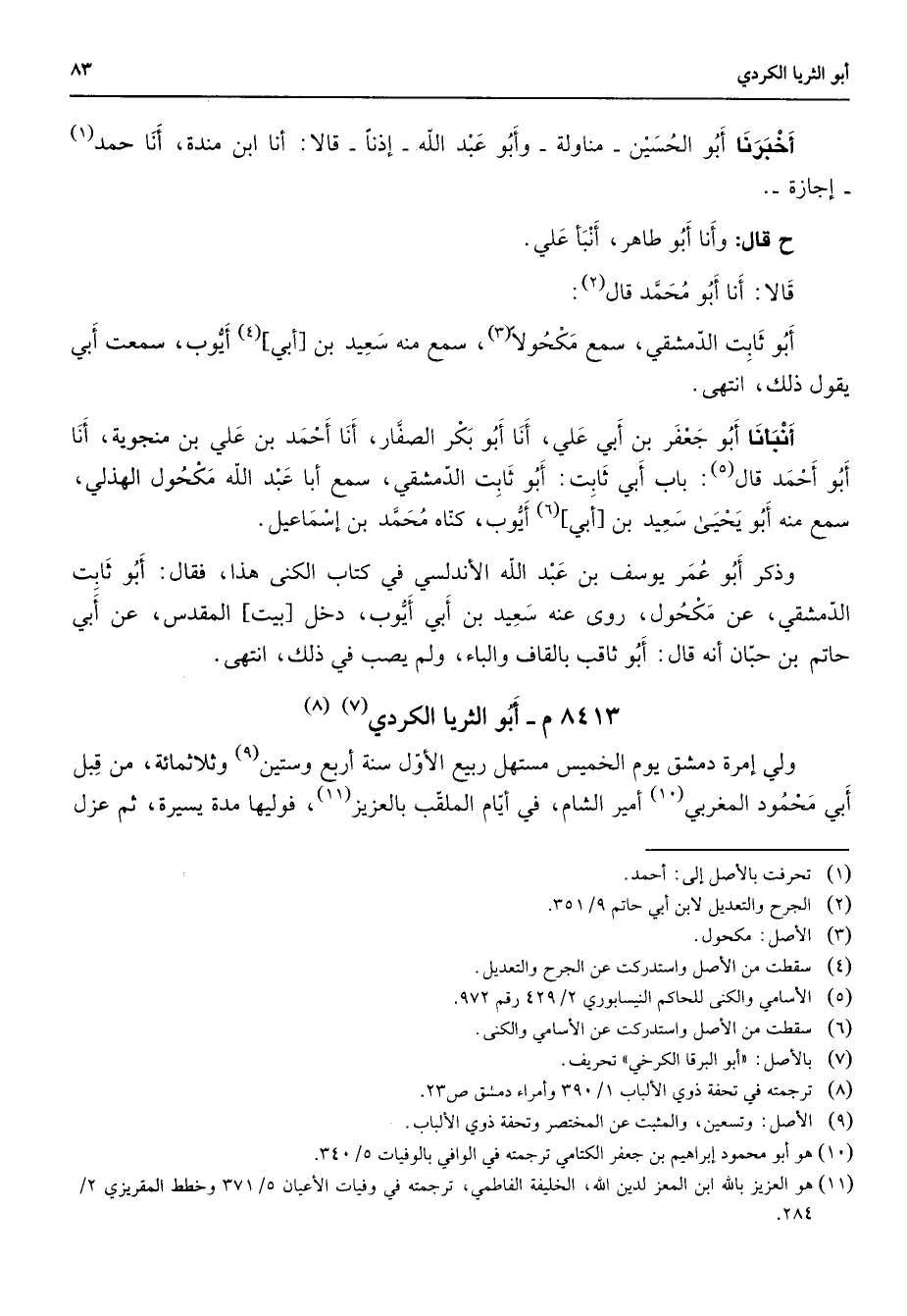 8413 - م أبو الثريا الكردي (7) (8) ولي إمرة دمشق يوم الخميس مستهل ربيع الأول سنة أربع وستين (9) وثلاثمائة من قبل أبي محمود المغربي (10) أمير الشام قي أيام الملقب بالعزيز (11) فوليها مدة يسيرة ثم عزل