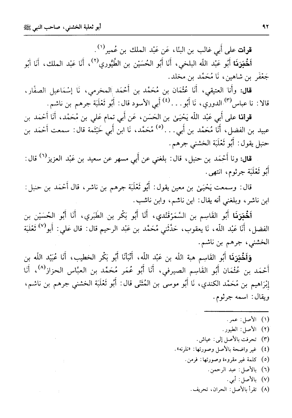 قرأت على أبي غالب بن البنا عن عبد الملك بن عمير (1) أخبرنا أبو عبد الله البلخي أنا أبو الحسين بن الطيوري (2) أنا عبد الملك أنا أبو جعفر بن شاهين نا محمد بن مخلد قال وأنا العتيقي أنا عثمان بن محمد بن أحمد المخرمي نا إسماعيل الصفار قالا نا عباس (3) الدوري نا أبو (4) أبي الأسود قال أبو ثعلبة جرهم بن ناشم قرأنا على أبي عبد الله يحيى بن الحسن عن أبي تمام علي بن محمد أنا أحمد بن عبيد بن الفضل أنا محمد بن أبي (5) محمد نا ابن أبي خيثمة قال سمعت أحمد بن حنبل يقول أبو ثعلبة الخشني جرهم قال ونا أحمد بن حنبل قال بلغني عن أبي مسهر عن سعيد بن عبد العزيز (6) قال أبو ثعلبة جرثوم انتهى قال وسمعت يحيى بن معين يقول أبو ثعلبة جرهم بن ناشر قال أحمد بن حنبل ابن ناشر وبلغني أنه يقال ابن ناشم وابن ناشب أخبرنا أبو القاسم بن السمرقندي أنا أبو بكر بن الطبري أنا أبو الحسين بن الفضل أنا عبد الله نا يعقوب حدثني محمد بن عبد الرحيم قال قال علي أبو (7) ثعلبة الخشني جرهم بن ناشم وأخبرنا أبو القاسم هبة الله بن عبد الله أنبأنا أبو بكر الخطيب أنا عبيد الله بن أحمد بن عثمان أبو القاسم الصيرفي أنا أبو عمر محمد بن العباس الحزاز (8) أنا إبراهيم بن محمد الكندي نا أبو موسى بن المثنى قال أبو ثعلبة الخشني جرهم بن ناشم ويقال اسمه جرثوم