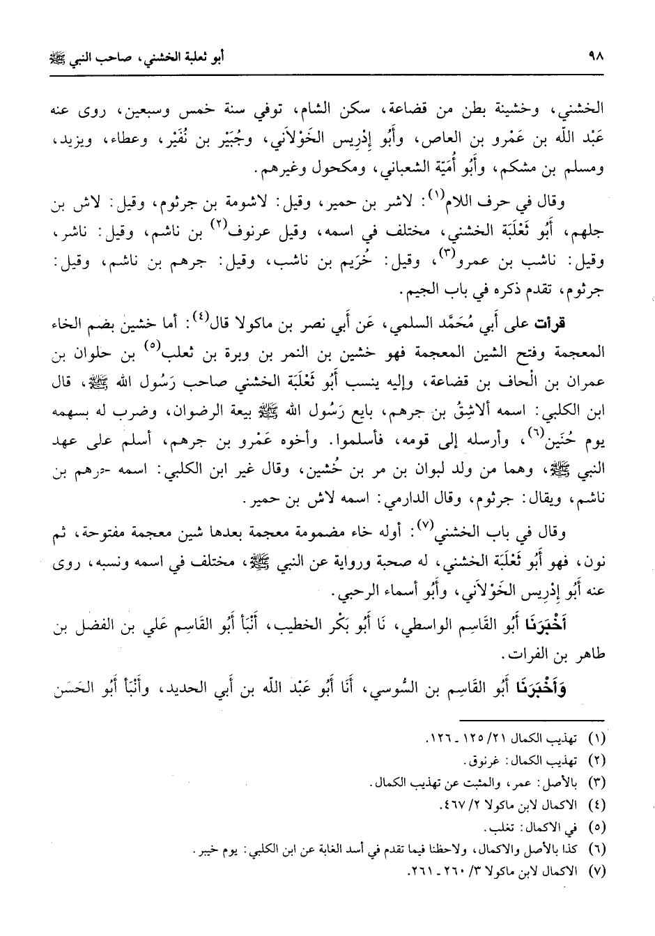 الخشني وخشينة بطن من قضاعة سكن الشام وتوفي سنة خمس وسبعين روى عنه عبد الله بن عمرو بن العاص وأبو إدريس الخولاني وجبير بن نفير وعطاء ويزيد ومسلم بن مشكم وأبو أمية الشعباني ومكحول وغيرهم قال قي حرف اللام (1) لاشر بن حمير وقيل لاشومة بن جرثوم وقيل لاش بن جلهم أبو ثعلبة الخشني مختلف في اسمه وقيل عرنوف (2) بن ناشم وقيل ناشر وقيل ناشب بن عمرو (3) وقيل خريم بن ناشب وقيل جرهم بن ناشم وقيل جرثوم تقدم ذكره في باب الجيم قرأت على أبي محمد السلمي عن أبي نصر بن ماكولا قال (4) أما خشين بضم الخاء المعجمة وفتح الشين المعجمة فهو خشين بن النمر بن وبرة بن ثعلب (5) بن حلوان بن عمران بن الحاف بن قضاعة وإليه ينسب أبو ثعلبة الخشني صاحب رسول الله (صلى الله عليه وسلم) قال ابن الكلبي اسمه ألاشق بن جرهم بايع رسول الله (صلى الله عليه وسلم) بيعة الرضوان وضرب له بسهمه يوم حنين (6) وأرسله إلى قومه فأسلموا وأخوه عمرو بن جرهم أسلم على عهد النبي (صلى الله عليه وسلم) وهما من ولد لبوان بن مر بن خشين وقال غير ابن الكلبي اسمه جرهم بن ناشم ويقال جرثوم وقال الدارمي اسمه لاش بن حمير وقال في باب الخشني (7) أوله خاء مضمومة معجمة بعدها شين معجمة مفتوحة ثم نون فهو أبو ثعلبة الخشني له صحبة ورواية عن النبي (صلى الله عليه وسلم) مختلف في اسمه ونسبه روى عنه أبو ادريس الخولاني وأبو أسماء الرحبي أخبرنا أبو القاسم الواسطي نا أبو بكر الخطيب أنبأ أبو القاسم علي بن الفضل بن طاهر بن الفرات أخبرنا أبو القاسم بن السوسي أنا أبو عبد الله بن أبي الحديد وأنبأ أبو الحسن