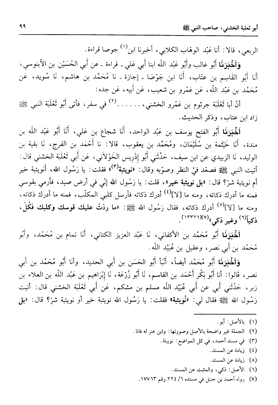 الربعي قالا أنا عبد الوهاب الكلابي أخبرنا ابن (1) جوصا قراءة وأخبرنا أبو غالب وأبو عبد الله ابنا أبي علي قراءة عن أبي الحسين بن الآبنوسي أنا أبو القاسم بن عتاب أنا أبو جوصا إجازة نا محمد بن هاشم نا سويد عن محمد بن عبد الله عن عمرو بن شعيب عن أبيه عن جده أن أبا ثعلبة جرثوم بن عمرو الخشني (2) في سفر فأتى أبو ثعلبة النبي (صلى الله عليه وسلم) زاد ابن عتاب وذكر الحديث أخبرنا أبو الفتح يوسف بن عبد الواحد أنا شجاع بن علي أنا أبو عبد الله بن مندة أنا خيثمة بن سليمان ومحمد بن يعقوب قالا نا أحمد بن الفرج نا بقية بن الوليد نا الزبيدي عن ابن سيف حدثني أبو إدريس الخولاني عن أبي ثعلبة الخشني قال أتيت النبي (صلى الله عليه وسلم) فصعد في النظر وصوبه وقال نويئبة (3) فقلت يا رسول الله أنويئبة خير أم نويئبة شر قال بل نويئبة خير قلت يا رسول الله إني في أرض صيد فأرمي بقوسي فمنه ما أدرك ذكاته ومنه ما لا (4) أدرك ذكاته فأرسل كلبي المكلب فمنه ما أدرك ذكاته ومنه ما لا (5) أدرك ذكاته فقال رسول الله (صلى الله عليه وسلم) ما ردت عليك قوسك وكلبك فكل ذكيا (6) وغير ذكي (7) أخبرنا أبو محمد بن الأكفاني نا عبد العزيز الكتاني أنا تمام بن محمد وأبو محمد بن أبي نصر وعقيل بن عبيد الله وأخبرنا أبو محمد أيضا أنبأ أبو الحسن بن أبي الحديد وأنا أبو محمد بن أبي نصر قالوا أنا أبو بكر أحمد بن القاسم نا أبو زرعة نا إبراهيم بن عبد الله بن العلاء بن زبر حدثني أبي عن أبي عبيد الله مسلم بن مشكم عن أبي ثعلبة الخشني قال أتيت رسول الله (صلى الله عليه وسلم) فقال لي نويئبه فقلت يا رسول الله نويئبة خير أو نويئبة شر قال بل