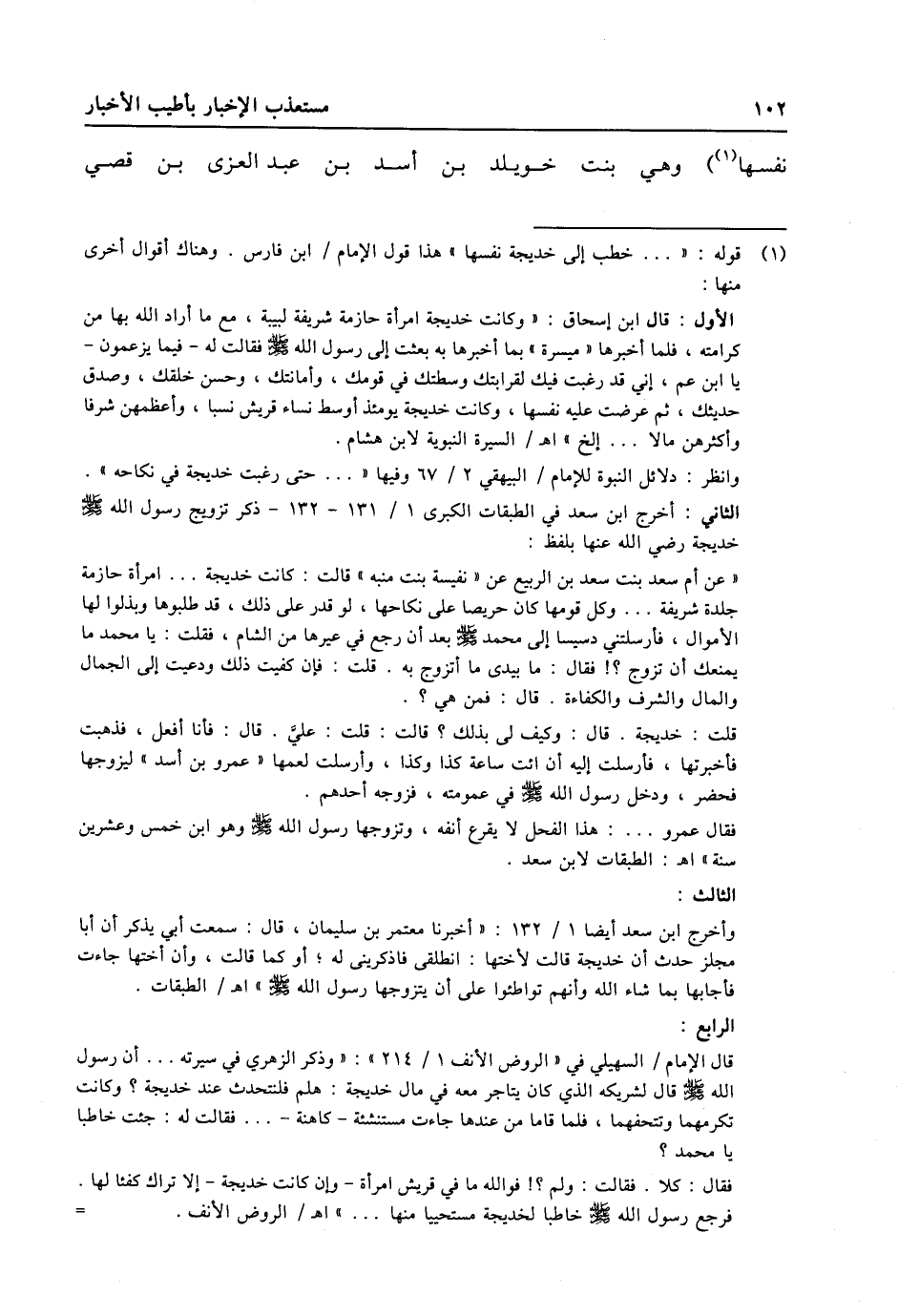 (1) قوله: « ... خطب إلى خديجة نفسها» هذا قول الإمام/ ابن فارس. وهناك أقوال أخرى منها: الأول: قال ابن إسحاق: «وكانت خديجة امرأة حازمة شريفة لبيبة، مع ما أراد الله بها من كرامته، فلما أخبرها «ميسرة» بما أخبرها به بعثت إلى رسول الله صلى الله عليه وسلّم فقالت له- فيما يزعمون- يا ابن عم، إني قد رغبت فيك لقرابتك وسطتك في قومك، وأمانتك، وحسن خلقك، وصدق حديثك، ثم عرضت عليه نفسها، وكانت خديجة يومئذ أوسط نساء قريش نسبا، وأعظمهن شرفا وأكثرهن مالا ... إلخ» اه/ السيرة النبوية لابن هشام. وانظر: دلائل النبوة للإمام/ البيهقي 2/ 67 وفيها « ... حتى رغبت خديجة في نكاحه» . الثاني: أخرج ابن سعد في الطبقات الكبرى 1/ 131- 132- ذكر تزويج رسول الله صلى الله عليه وسلّم خديجة رضي الله عنها بلفظ: «عن أم سعد بنت سعد بن الربيع عن «نفيسة بنت منبه» قالت: كانت خديجة ... امرأة حازمة جلدة شريفة ... وكل قومها كان حريصا على نكاحها، لو قدر على ذلك، قد طلبوها وبذلوا لها الأموال، فأرسلتني دسيسا إلى محمد صلى الله عليه وسلّم بعد أن رجع في عيرها من الشام، فقلت: يا محمد ما يمنعك أن تزوج؟! فقال: ما بيدى ما أتزوج به. قلت: فإن كفيت ذلك ودعيت إلى الجمال والمال والشرف والكفاءة. قال: فمن هي؟. قلت: خديجة. قال: وكيف لى بذلك؟ قالت: قلت: عليّ. قال: فأنا أفعل، فذهبت فأخبرتها، فأرسلت إليه أن ائت ساعة كذا وكذا، وأرسلت لعمها «عمرو بن أسد» ليزوجها فحضر، ودخل رسول الله صلى الله عليه وسلّم في عمومته، فزوجه أحدهم. فقال عمرو ... : هذا الفحل لا يقرع أنفه، وتزوجها رسول الله صلى الله عليه وسلّم وهو ابن خمس وعشرين سنة» اه: الطبقات لابن سعد. الثالث: وأخرج ابن سعد أيضا 1/ 132: «أخبرنا معتمر بن سليمان، قال: سمعت أبي يذكر أن أبا مجلز حدث أن خديجة قالت لأختها: انطلقى فاذكرينى له؛ أو كما قالت، وأن أختها جاءت فأجابها بما شاء الله وأنهم تواطئوا على أن يتزوجها رسول الله صلى الله عليه وسلّم» اه/ الطبقات. الرابع: قال الإمام/ السهيلي في «الروض الأنف 1/ 214» : «وذكر الزهري في سيرته ... أن رسول الله صلى الله عليه وسلّم قال لشريكه الذي كان يتاجر معه في مال خديجة: هلم فلنتحدث عند خديجة؟ وكانت تكرمهما وتتحفهما، فلما قاما من عندها جاءت مستنشئة- كاهنة- ... فقالت له: جئت خاطبا يا محمد؟ فقال: كلا. فقالت: ولم؟! فو الله ما في قريش امرأة- وإن كانت خديجة- إلا تراك كفئا لها. فرجع رسول الله صلى الله عليه وسلّم خاطبا لخديجة مستحييا منها ... » اه/ الروض الأنف.