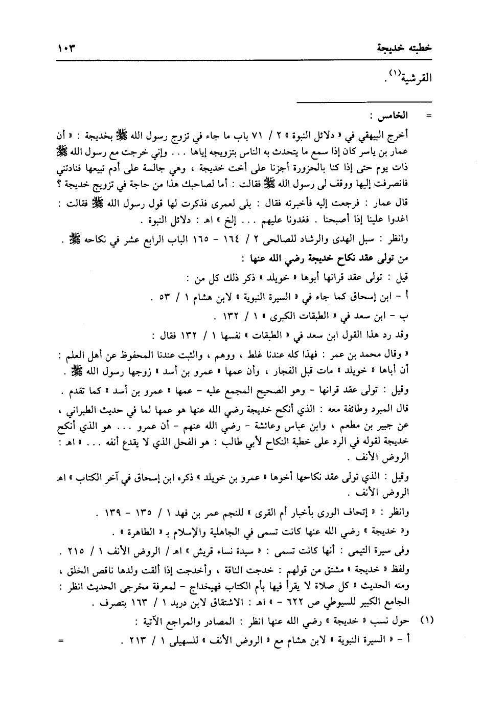 (1) حول نسب «خديجة» رضي الله عنها انظر: المصادر والمراجع الاتية: أ- «السيرة النبوية» لابن هشام مع «الروض الأنف» للسهيلى 1/ 213.