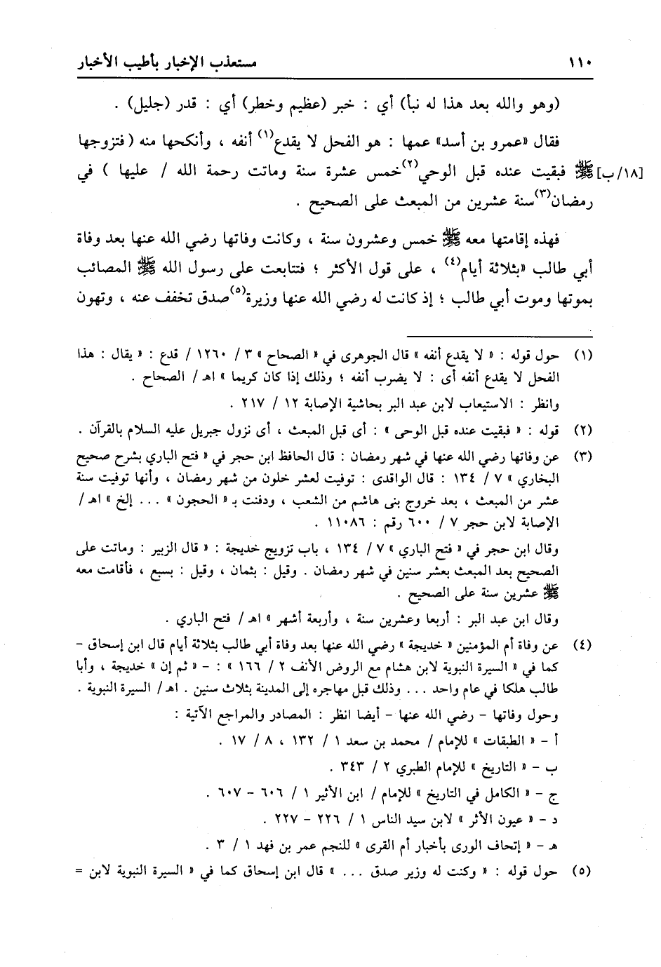 (4) عن وفاة أم المؤمنين «خديجة» رضي الله عنها بعد وفاة أبي طالب بثلاثة أيام قال ابن إسحاق- كما في «السيرة النبوية لابن هشام مع الروض الأنف 2/ 166» : - «ثم إن» خديجة، وأبا طالب هلكا في عام واحد ... وذلك قبل مهاجره إلى المدينة بثلاث سنين. اه/ السيرة النبوية. وحول وفاتها- رضي الله عنها- أيضا انظر: المصادر والمراجع الاتية: أ- «الطبقات» للإمام/ محمد بن سعد 1/ 132، 8/ 17. ب- «التاريخ» للإمام الطبري 2/ 343. ج- «الكامل في التاريخ» للإمام/ ابن الأثير 1/ 606- 607. د- «عيون الأثر» لابن سيد الناس 1/ 226- 227. هـ- «إتحاف الورى بأخبار أم القرى» للنجم عمر بن فهد 1/ 3.