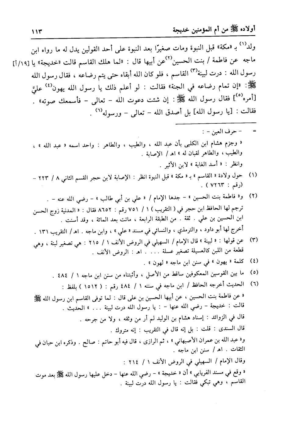 (6) الحديث أخرجه الحافظ/ ابن ماجه في سننه 1/ 484 رقم: (1512) بلفظ: «عن فاطمة بنت الحسين، عن أبيها الحسين بن على قال: لما توفى القاسم ابن رسول الله صلى الله عليه وسلّم قالت: خديجة- رضي الله عنها-: يا رسول الله درت لبينة ... » الحديث. قال في الزوائد: إسناد هشام بن الوليد لم أر من وثقه، ولا من جرحه. قال السندى: قلت: بل إنه قال في التقريب: إنه متروك. و «عبد الله بن عمران الأصبهاني» ، ثم الرازى، قال فيه أبو حاتم: صالح. وذكره ابن حبان في الثقات. اه/ سنن ابن ماجه. وقال الإمام/ السهيلي في الروض الأنف 1/ 214: «وقع في مسند الفريابي» أن «خديجة» - رضي الله عنها- دخل عليها رسول الله صلى الله عليه وسلّم بعد موت القاسم، وهي تبكي فقالت: يا رسول الله درت لبينة.