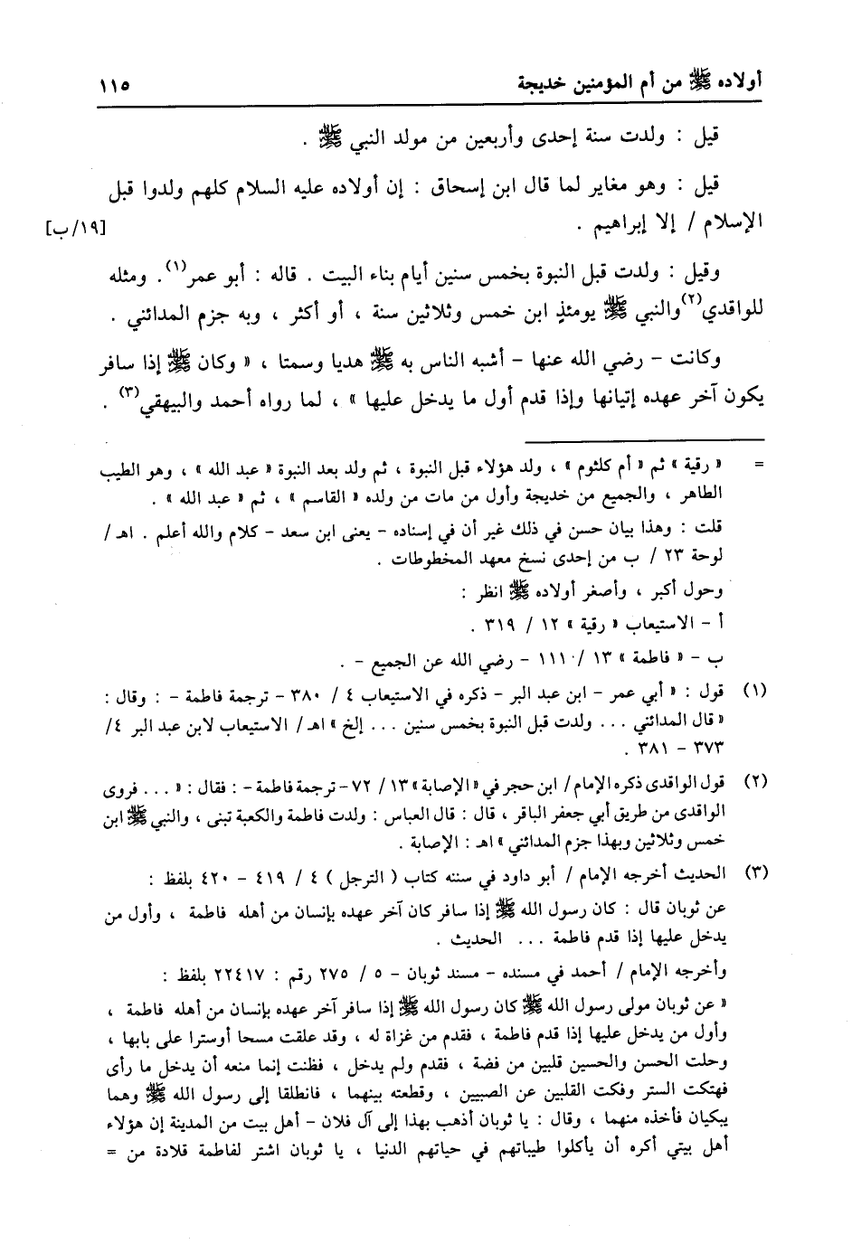 (1) قول: «أبي عمر- ابن عبد البر- ذكره في الاستيعاب 4/ 380- ترجمة فاطمة-: وقال: «قال المدائني ... ولدت قبل النبوة بخمس سنين ... إلخ» اه/ الاستيعاب لابن عبد البر 4/ 373- 381.