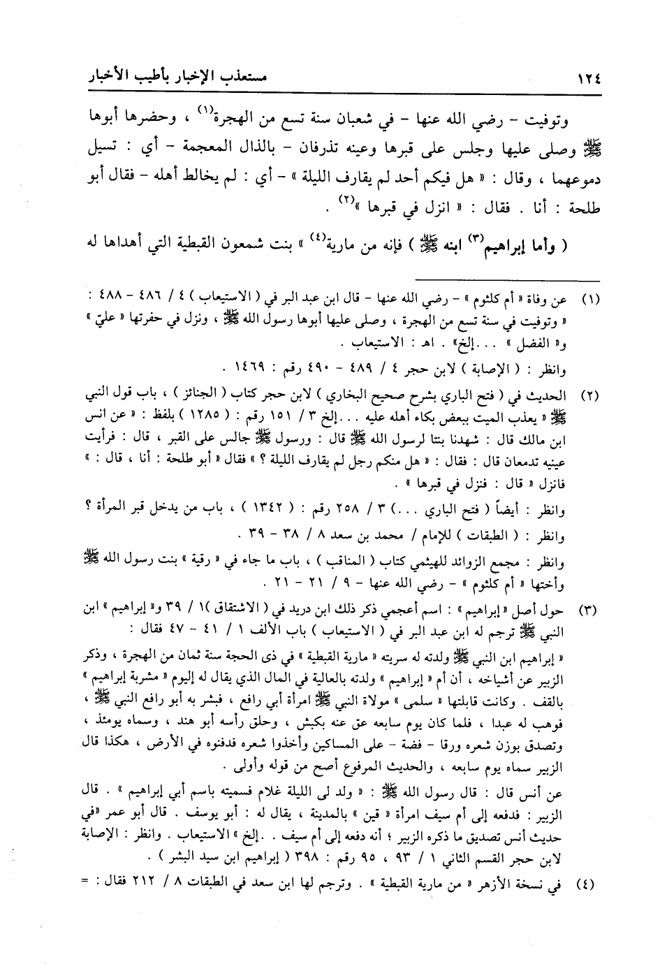 (1) عن وفاة «أم كلثوم» - رضي الله عنها- قال ابن عبد البر في (الاستيعاب) 4/ 486- 488: «وتوفيت في سنة تسع من الهجرة، وصلى عليها أبوها رسول الله صلى الله عليه وسلّم، ونزل في حفرتها «عليّ» و «الفضل» ... إلخ» . اه: الاستيعاب. وانظر: (الإصابة) لابن حجر 4/ 489- 490 رقم: 1469.