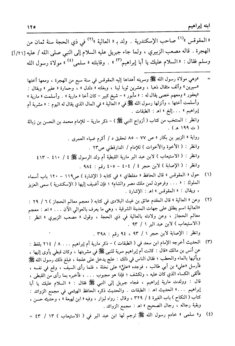 - «وهي مولاة رسول الله صلى الله عليه وسلّم وسريته أهداها إليه المقوقس في سنة سبع من الهجرة، ومعها أختها «سيرين» وألف مثقال ذهبا، وعشرين ثوبا لينا، وبغلته «دلدل» ، وحمارة «عفير» وبقال: «يعفور» ومعهم خصى يقال له: «مأبور» - شيخ كبير- كان أخا «مارية» . وأسلمت «مارية» وأسلمت أختها، وأنزلها رسول الله صلى الله عليه وسلّم في «العالية» في المال الذي يقال له اليوم: «مشربة أم إبراهيم» ... إلخ» اه: الطبقات. وانظر: المنتخب من كتاب (أزواج النبي صلى الله عليه وسلّم) - ذكر مارية- للإمام محمد بن الحسن بن زبالة (ت 199 هـ) . رواية «الزبير بن بكار» ص 77- 85 تحقيق د/ أكرم ضياء العمرى. وانظر: (الأخوة والأخوات) للإمام/ الدارقطني ص 23. وانظر: (الاستيعاب) لابن عبد البر مارية القبطية أم ولد الرسول صلى الله عليه وسلّم 4/ 410- 413 وانظر: (الإصابة) لابن حجر 4/ 404- 405 رقم: 984.