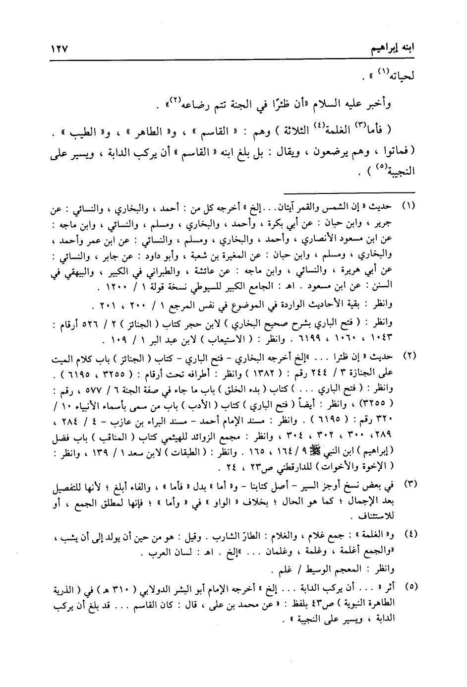 (5) أثر « ... أن يركب الدابة ... إلخ» أخرجه الإمام أبو البشر الدولابي (310 هـ) في (الذرية الطاهرة النبوية) ص 43 بلفظ: «عن محمد بن على، قال: كان القاسم ... قد بلغ أن يركب الدابة، ويسير على النجيبة» .
