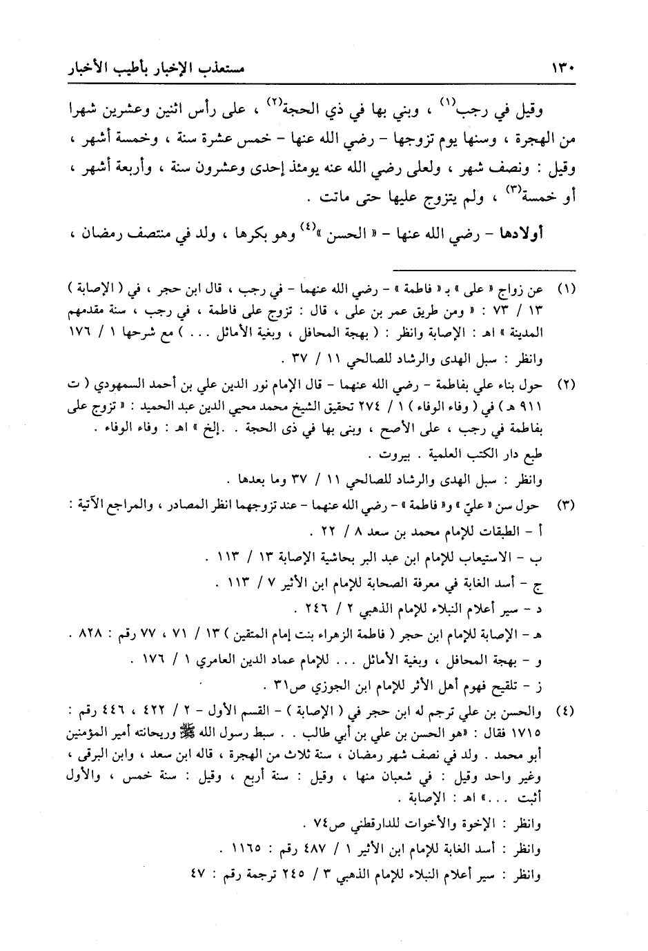 (3) حول سن «عليّ» و «فاطمة» - رضي الله عنهما- عند تزوجهما انظر المصادر، والمراجع الاتية: أ- الطبقات للإمام محمد بن سعد 8/ 22. ب- الاستيعاب للإمام ابن عبد البر بحاشية الإصابة 13/ 113. ج- أسد الغابة في معرفة الصحابة للإمام ابن الأثير 7/ 113. د- سير أعلام النبلاء للإمام الذهبي 2/ 246. هـ- الإصابة للإمام ابن حجر (فاطمة الزهراء بنت إمام المتقين) 13/ 71، 77 رقم: 828. وبهجة المحافل، وبغية الأماثل ... للإمام عماد الدين العامري 1/ 176. ز- تلقيح فهوم أهل الأثر للإمام ابن الجوزي ص 31.