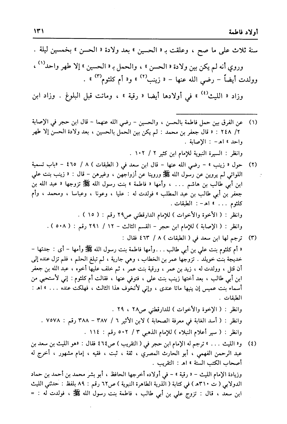 (4) و «الليث ... » ترجم له الإمام ابن حجر في (التقريب) ص 464 فقال: «هو الليث بن سعد بن عبد الرحمن الفهمي، أبو الحارث المصري، ثقة، ثبت، فقيه، إمام مشهور، أخرج له أصحاب الكتب الستة» اه: التقريب. وزيادة الإمام الليث- «رقية» - في أولاده أخرجها الحافظ، أبو بشر محمد بن أحمد بن حماد الدولابي (ت 310 هـ) في كتابة (الذرية الطاهرة النبوية) ص 62 رقم: 89 بلفظ: حدثني الليث ابن سعد، قال: تزوج علي بن أبي طالب، فاطمة بنت رسول الله صلى الله عليه وسلّم، فولدت له: -