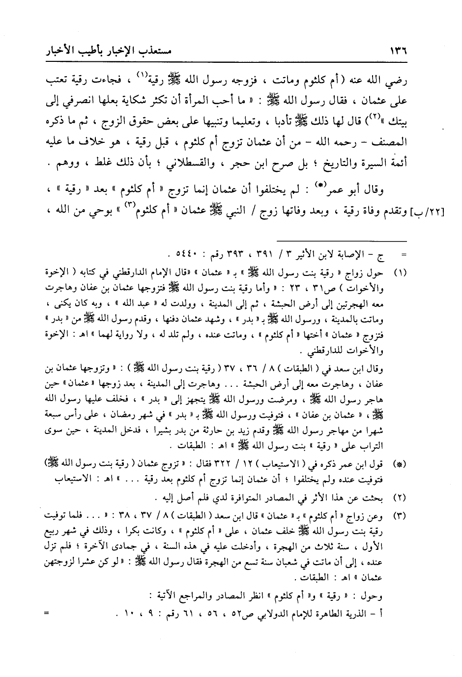 (1) حول زواج «رقية بنت رسول الله صلى الله عليه وسلّم» ب «عثمان» «قال الإمام الدارقطني في كتابه (الإخوة والأخوات) ص 31، 23: «وأما رقية بنت رسول الله صلى الله عليه وسلّم فتزوجها عثمان بن عفان وهاجرت معه الهجرتين إلى أرض الحبشة، ثم إلى المدينة، وولدت له «عبد الله» ، وبه كان يكنى، وماتت بالمدينة، ورسول الله صلى الله عليه وسلّم ب «بدر» ، وشهد عثمان دفنها، وقدم رسول الله صلى الله عليه وسلّم من «بدر» فتزوج «عثمان» أختها «أم كلثوم» ، وماتت عنده، ولم تلد له، ولا رواية لهما» اه: الإخوة والأخوات للدارقطني. وقال ابن سعد في (الطبقات) 8/ 36، 37 (رقية بنت رسول الله صلى الله عليه وسلّم) : «وتزوجها عثمان بن عفان، وهاجرت معه إلى أرض الحبشة ... وهاجرت إلى المدينة، بعد زوجها «عثمان» حين هاجر رسول الله صلى الله عليه وسلّم، ومرضت ورسول الله صلى الله عليه وسلّم يتجهز إلى «بدر» ، فخلف عليها رسول الله صلى الله عليه وسلّم، «عثمان بن عفان» ، فتوفيت ورسول الله صلى الله عليه وسلّم ب «بدر» في شهر رمضان، على رأس سبعة شهرا من مهاجر رسول الله صلى الله عليه وسلّم وقدم زيد بن حارثة من بدر بشيرا، فدخل المدينة، حين سوى التراب على «رقية» بنت رسول الله صلى الله عليه وسلّم» اه: الطبقات.