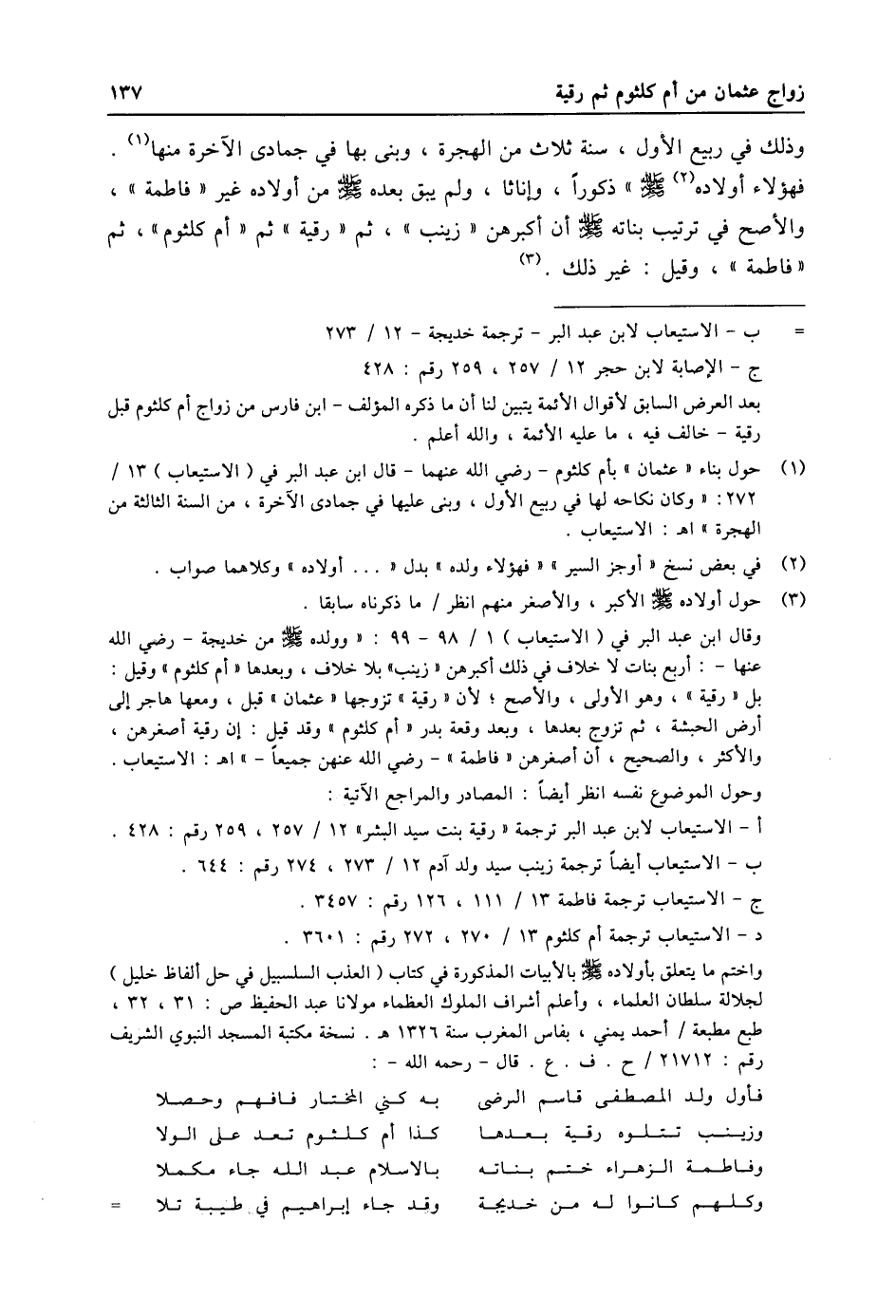 (1) حول بناء «عثمان» بأم كلثوم- رضي الله عنهما- قال ابن عبد البر في (الاستيعاب) 13/ 272: «وكان نكاحه لها في ربيع الأول، وبنى عليها في جمادى الاخرة، من السنة الثالثة من الهجرة» اه: الاستيعاب.