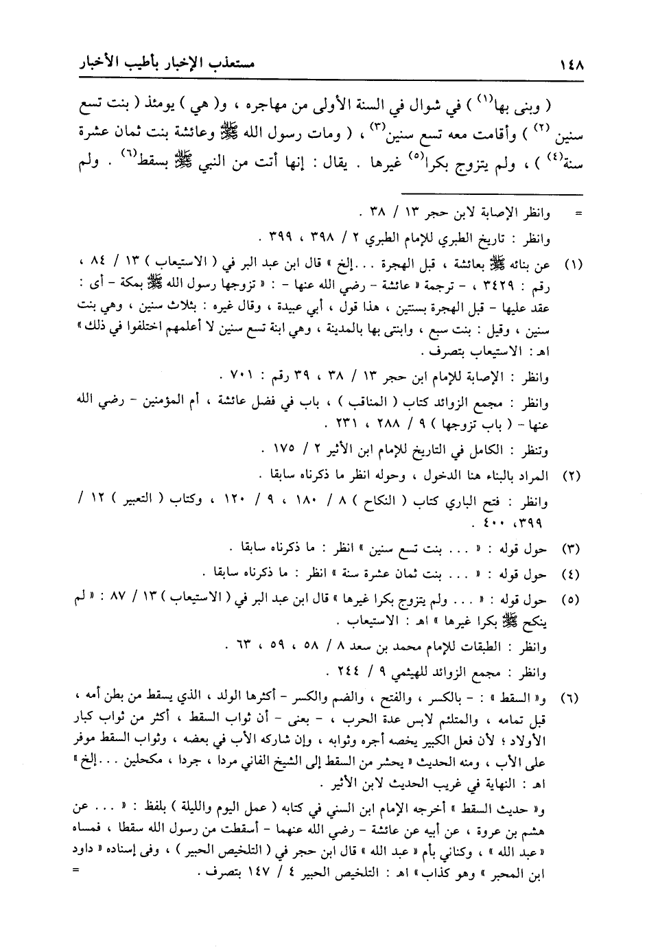 (5) حول قوله: « ... ولم يتزوج بكرا غيرها» قال ابن عبد البر في (الاستيعاب) 13/ 87: «لم ينكح صلى الله عليه وسلّم بكرا غيرها» اه: الاستيعاب. وانظر: الطبقات للإمام محمد بن سعد 8/ 58، 59، 63. وانظر: مجمع الزوائد للهيثمي 9/ 244.