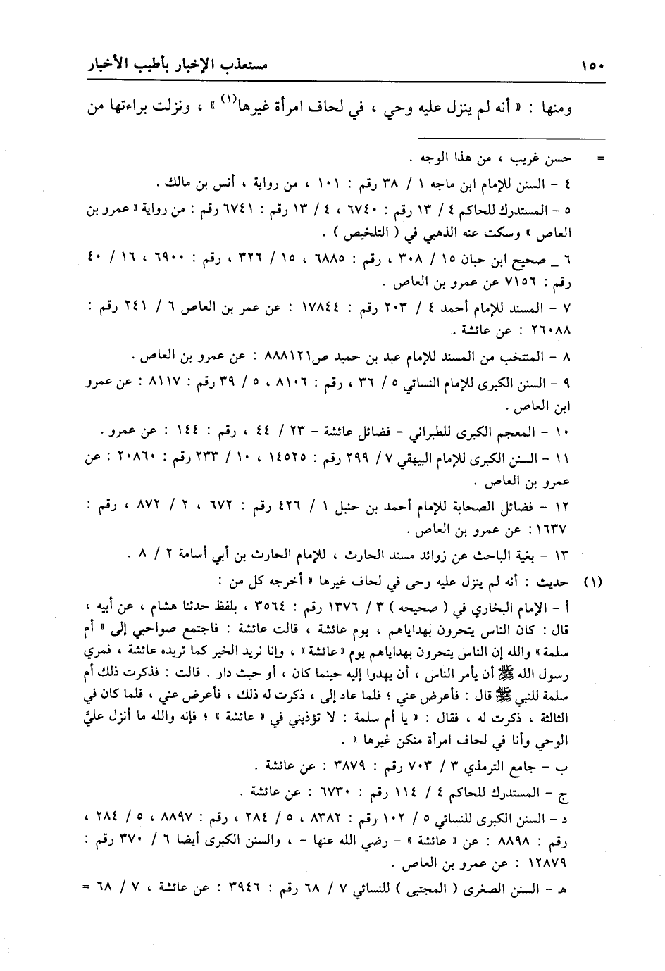 (1) حديث: أنه لم ينزل عليه وحى في لحاف غيرها «أخرجه كل من: أ- الإمام البخاري في (صحيحه) 3/ 1376 رقم: 3564، بلفظ حدثنا هشام، عن أبيه، قال: كان الناس يتحرون بهداياهم، يوم عائشة، قالت عائشة: فاجتمع صواحبي إلى «أم سلمة» والله إن الناس يتحرون بهداياهم يوم «عائشة» ، وإنا نريد الخير كما تريده عائشة، فمري رسول الله صلى الله عليه وسلّم أن يأمر الناس، أن يهدوا إليه حينما كان، أو حيث دار. قالت: فذكرت ذلك أم سلمة للنبي صلى الله عليه وسلّم قال: فأعرض عني؛ فلما عاد إلى، ذكرت له ذلك، فأعرض عني، فلما كان في الثالثة، ذكرت له، فقال: «يا أم سلمة: لا تؤذيني في «عائشة» ؛ فإنه والله ما أنزل عليّ الوحي وأنا في لحاف امرأة منكن غيرها» . ب- جامع الترمذي 3/ 703 رقم: 3879: عن عائشة. ج- المستدرك للحاكم 4/ 114 رقم: 6730: عن عائشة. د- السنن الكبرى للنسائي 5/ 102 رقم: 8382، 5/ 284، رقم: 8897، 5/ 284، رقم: 8898: عن «عائشة» - رضي الله عنها-، والسنن الكبرى أيضا 6/ 370 رقم: 12879: عن عمرو بن العاص. هـ- السنن الصغرى (المجتبى) للنسائي 7/ 68 رقم: 3946: عن عائشة، 7/ 68-