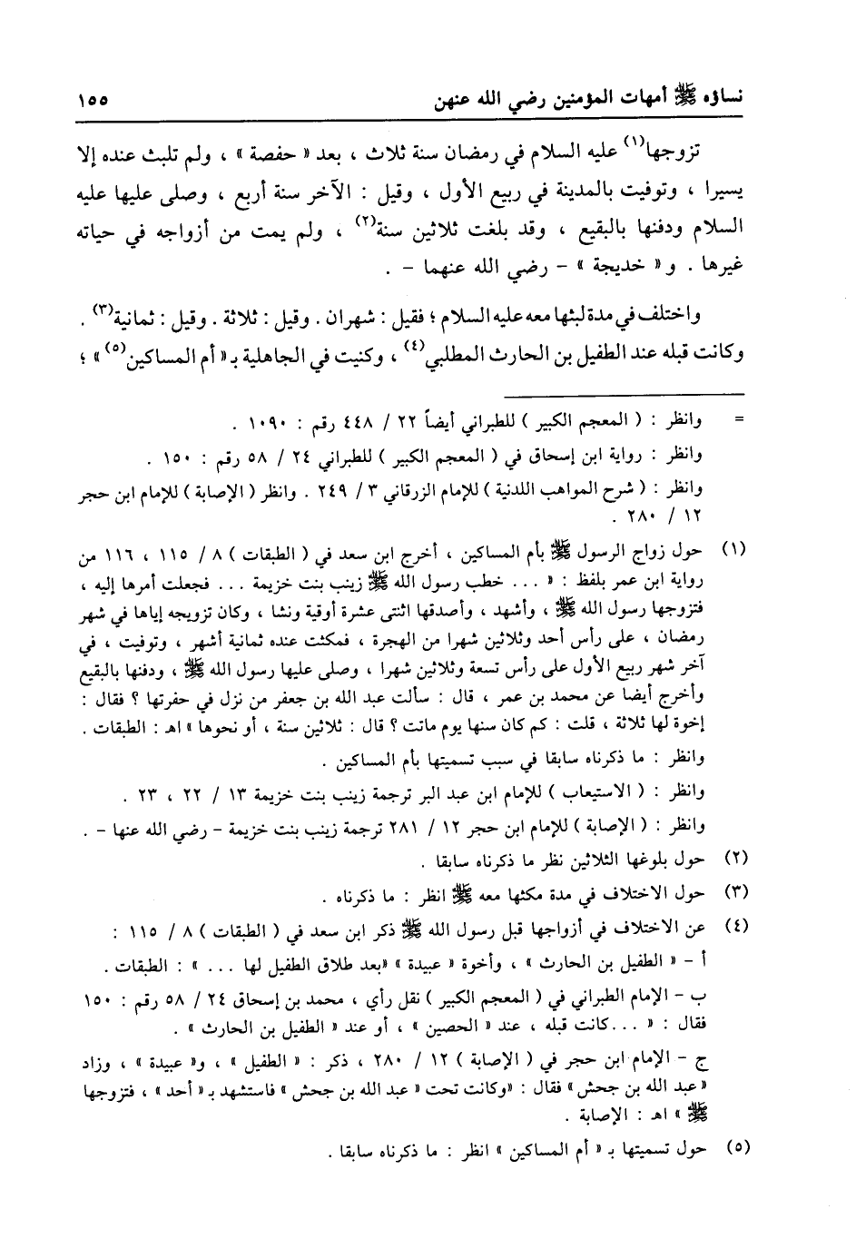 (1) حول زواج الرسول صلى الله عليه وسلّم بأم المساكين، أخرج ابن سعد في (الطبقات) 8/ 115، 116 من رواية ابن عمر بلفظ: « ... خطب رسول الله صلى الله عليه وسلّم زينب بنت خزيمة ... فجعلت أمرها إليه، فتزوجها رسول الله صلى الله عليه وسلّم، وأشهد، وأصدقها اثنتى عشرة أوقية ونشا، وكان تزويجه إياها في شهر رمضان، على رأس أحد وثلاثين شهرا من الهجرة، فمكثت عنده ثمانية أشهر، وتوفيت، في آخر شهر ربيع الأول على رأس تسعة وثلاثين شهرا، وصلى عليها رسول الله صلى الله عليه وسلّم، ودفنها بالبقيع وأخرج أيضا عن محمد بن عمر، قال: سألت عبد الله بن جعفر من نزل في حفرتها؟ فقال: إخوة لها ثلاثة، قلت: كم كان سنها يوم ماتت؟ قال: ثلاثين سنة، أو نحوها» اه: الطبقات. وانظر: ما ذكرناه سابقا في سبب تسميتها بأم المساكين. وانظر: (الاستيعاب) للإمام ابن عبد البر ترجمة زينب بنت خزيمة 13/ 22، 23. وانظر: (الإصابة) للإمام ابن حجر 12/ 281 ترجمة زينب بنت خزيمة- رضي الله عنها-.