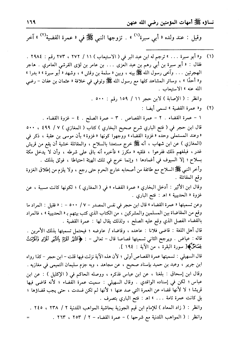 (2) و «عمرة القضية» تسمى أيضا: 1- عمرة القضاء. 2- عمرة القصاص. 3- عمرة الصلح. 4- غزوة القضاء. قال ابن حجر في (فتح الباري شرح صحيح البخاري) كتاب (المغازي) 7/ 499، 500 «وعند المستملى وحده «غزوة القضاء» ووجهوا كونها «غزوة» بأن موسى بن عقبة، ذكر في (المغازي) عن ابن شهاب، أنه صلى الله عليه وسلّم خرج مستعدا بالسلاح، والمقاتلة خشية أن يقع من قريش غدر، فبلغهم ذلك ففرعوا، فلقيه «مكرز» فأخبره أنه باق على شرطه، وأن لا يدخل مكة بسلاح؛ إلا السيوف في أغمادها؛ وإنما خرج في تلك الهيئة احتياطا، فوثق بذلك. وأخر النبي صلى الله عليه وسلّم السلاح مع طائفة من أصحابه خارج الحرم حتى رجع، ولا يلزم من إطلاق الغزوة وقع المقاتلة. وقال ابن الأثير: أدخل البخاري «عمرة القضاء» في (المغازي) ؛ لكونها كانت مسببة، عن غزوة «الحديبية» اه: فتح الباري. وعن تسميتها «عمرة القضاء» قال ابن حجر في نفس المصدر- 7/ 500-: «فقيل: المراد ما وقع من المقاضاة بين المسلمين والمشركين، من الكتاب الذي كتب بيتهم ب «الحديبية» ، فالمراد بالقضاء الفصل الذي وقع عليه الصلح، ولذلك يقال لها: عمرة القضية. قال أهل اللغة: قاضى فلانا: عاهده، وقاضاه/ عاوضه؛ فيحتمل تسميتها بذلك الأمرين. قاله: عياض. ويرجح الثاني تسميتها قصاصا قال- تعالى-: الشَّهْرُ الْحَرامُ بِالشَّهْرِ الْحَرامِ وَالْحُرُماتُ قِصاصٌ [سورة البقرة، من الاية: 194] . قال السهيلي: تسميتها عمرة القصاص أولى؛ لأن هذه الاية نزلت فيها قلت- ابن حجر- كذا رواه ابن جرير، وعبد بن حميد بإسناد صحيح، عن مجاهد، وبه جزم سليمان التميمى في مغازيه. وقال ابن إسحاق: بلغنا، عن ابن عباس فذكره، ووصله الحاكم في (الإكليل) : عن ابن عباس؛ لكن في إسناده الواقدي. وقال السهيلي: سميت عمرة القضاء؛ لأنه قاضى فيها قريشا؛ لا لأنها قضاء عن العمرة التي صد عنها؛ لأنها لم تكن فسدت، حتى يجب قضاؤها؛ بل كانت عمرة تامة ... » اه: فتح الباري بتصرف. وانظر: (زاد المعاد) للإمام ابن قيم الجوزية بحاشية المواهب اللدنية 2/ 238، 245. وانظر: (المواهب اللدنية مع شرحها) - عمرة القضاء- 2/ 253، 263.