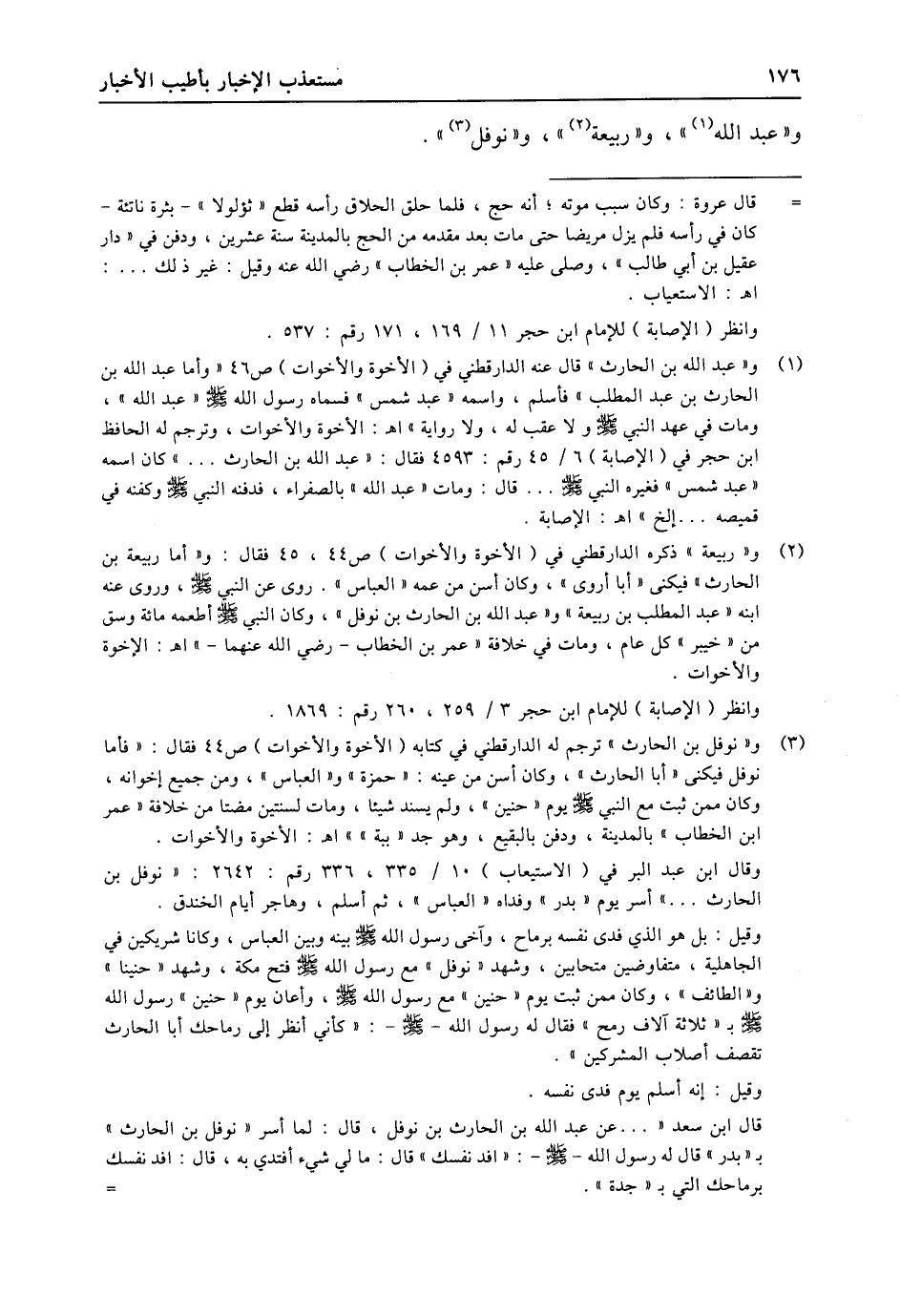 (3) و «نوفل بن الحارث» ترجم له الدارقطني في كتابه (الأخوة والأخوات) ص 44 فقال: «فأما نوفل فيكنى «أبا الحارث» ، وكان أسن من عينه: «حمزة» و «العباس» ، ومن جميع إخوانه، وكان ممن ثبت مع النبي صلى الله عليه وسلّم يوم «حنين» ، ولم يسند شيئا، ومات لسنتين مضتا من خلافة «عمر ابن الخطاب» بالمدينة، ودفن بالبقيع، وهو جد «ببة» اه: الأخوة والأخوات. وقال ابن عبد البر في (الاستيعاب) 10/ 335، 336 رقم: 2642: «نوفل بن الحارث ... » أسر يوم «بدر» وفداه «العباس» ، ثم أسلم، وهاجر أيام الخندق. وقيل: بل هو الذي فدى نفسه برماح، وآخى رسول الله صلى الله عليه وسلّم بينه وبين العباس، وكانا شريكين في الجاهلية، متفاوضين متحابين، وشهد «نوفل» مع رسول الله صلى الله عليه وسلّم فتح مكة، وشهد «حنينا» و «الطائف» ، وكان ممن ثبت يوم «حنين» مع رسول الله صلى الله عليه وسلّم، وأعان يوم «حنين» رسول الله صلى الله عليه وسلّم ب «ثلاثة آلاف رمح» فقال له رسول الله- صلى الله عليه وسلّم-: «كأني أنظر إلى رماحك أبا الحارث تقصف أصلاب المشركين» . وقيل: إنه أسلم يوم فدى نفسه. قال ابن سعد « ... عن عبد الله بن الحارث بن نوفل، قال: لما أسر «نوفل بن الحارث» ب «بدر» قال له رسول الله- صلى الله عليه وسلّم-: «افد نفسك» قال: ما لي شيء أفتدي به، قال: افد نفسك برماحك التي ب «جدة» .