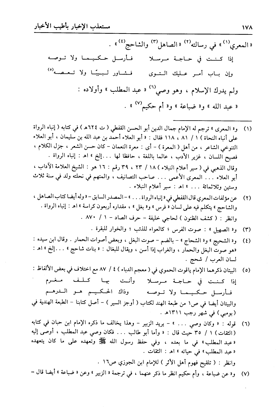 (1) و «المعرى» ترجم له الإمام جمال الدين أبو الحسن القفطي (ت 624 هـ) في كتابه (إنباه الرواة على أنباه النحاة) 1/ 81، 118 فقال: «أبو العلاء أحمد بن عبد الله بن سليمان، أبو العلاء التنوخي الشاعر، من أهل (المعرة) - أى: معرة النعمان- كان حسن الشعر، جزل الكلام، فصيح اللسان، غزير الأدب، عالما باللغة، حافظا لها.... إلخ» اه: إنباه الرواة. وقال الذهبي في (سير أعلام النبلاء) 18/ 23، 39 رقم: 16 هو: الشيخ العلامة الاداب، أبو العلاء ... المعرى الأعمى ... صاحب التصانيف، والمتهم في نحلته ولد في سنة ثلاث وستين وثلاثمائة ... » اه: سير أعلام النبلاء.