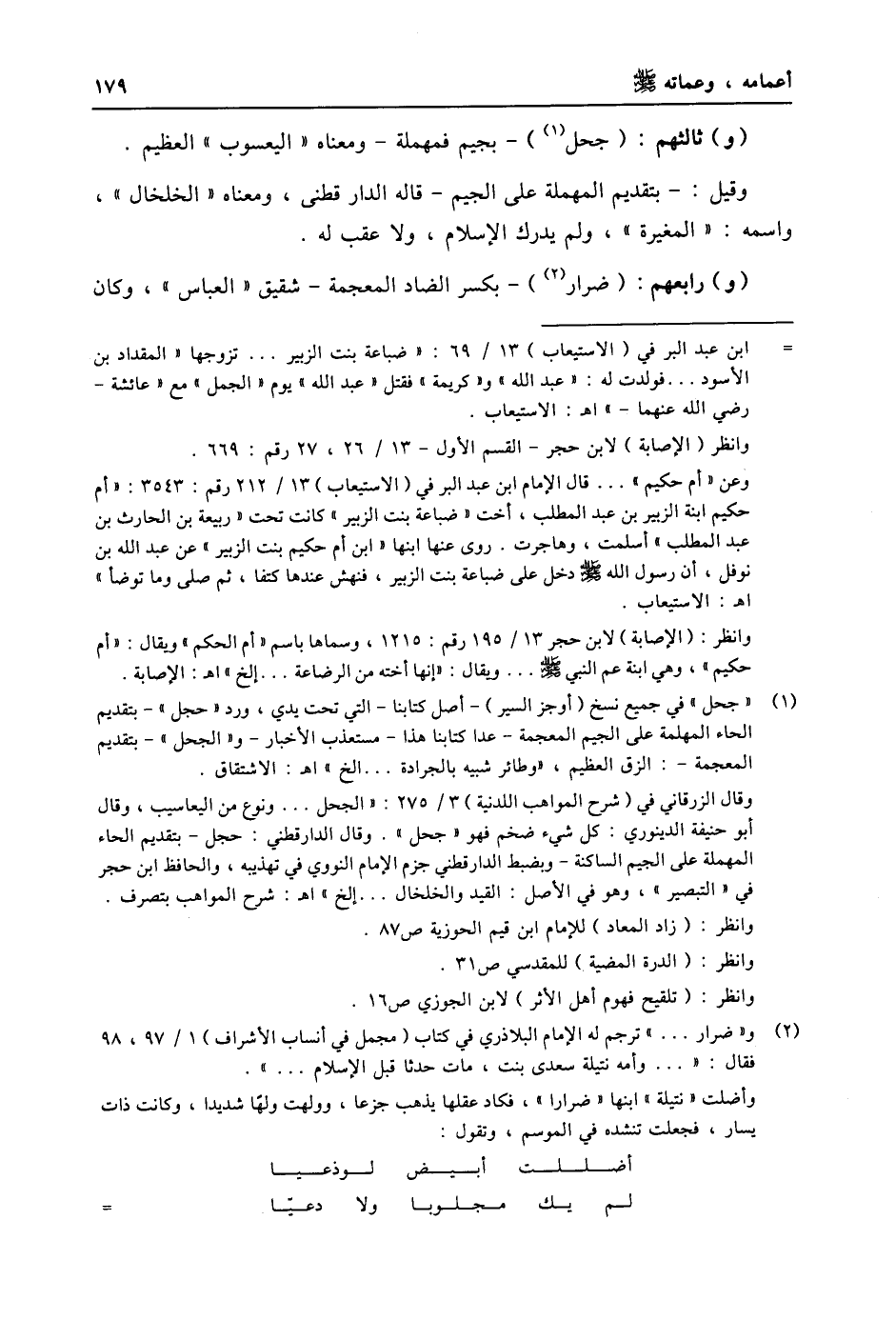 - ابن عبد البر في (الاستيعاب) 13/ 69: «ضباعة بنت الزبير ... تزوجها «المقداد بن الأسود ... فولدت له: «عبد الله» و «كريمة» فقتل «عبد الله» يوم «الجمل» مع «عائشة- رضي الله عنهما-» اه: الاستيعاب. وانظر (الإصابة) لابن حجر- القسم الأول- 13/ 26، 27 رقم: 669. وعن «أم حكيم» ... قال الإمام ابن عبد البر في (الاستيعاب) 13/ 212 رقم: 3543: «أم حكيم ابنة الزبير بن عبد المطلب، أخت «ضباعة بنت الزبير» كانت تحت «ربيعة بن الحارث بن عبد المطلب» أسلمت، وهاجرت. روى عنها ابنها «ابن أم حكيم بنت الزبير» عن عبد الله بن نوفل، أن رسول الله صلى الله عليه وسلّم دخل على ضباعة بنت الزبير، فنهش عندها كتفا، ثم صلى وما توضأ» اه: الاستيعاب. وانظر: (الإصابة) لابن حجر 13/ 195 رقم: 1215، وسماها باسم «أم الحكم» ويقال: «أم حكيم» ، وهي ابنة عم النبي صلى الله عليه وسلّم ... ويقال: «إنها أخته من الرضاعة ... إلخ» اه: الإصابة.