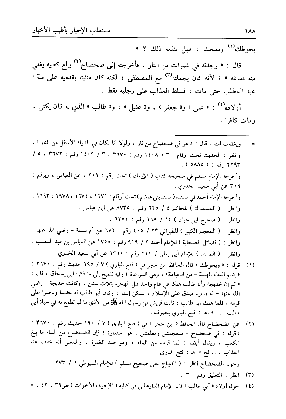 (2) عن الضحضاح قال الحافظ «ابن حجر» في (فتح الباري) 7/ 195 حديث رقم: 3670: «قوله: في ضحضاح- بمعجمتين ومعلمتين، هو استعارة؛ فإن الضحضاح من الماء ما بلغ الكعب، ويقال أيضا: لما قرب من الماء، وهو ضد الغمرة، والمعنى أنه خفف عنه العذاب ... إلخ» اه: فتح الباري. وحول الضحضاح انظر: (الديباج على صحيح مسلم) للإمام السيوطي 1/ 273.