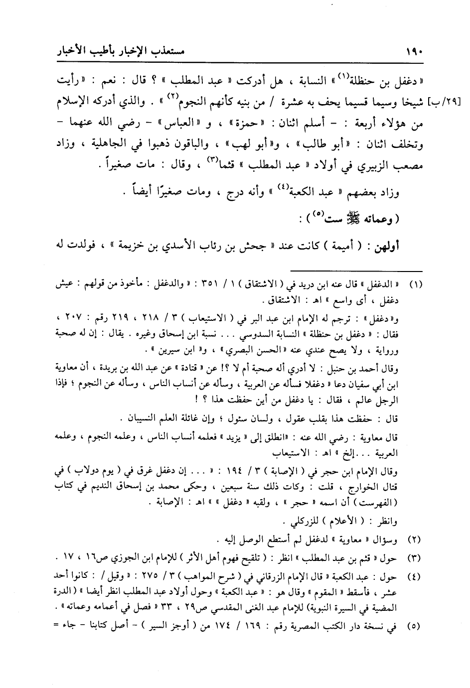 «دغفل بن حنظلة «1» » النسابة، هل أدركت «عبد المطلب» ؟ قال: نعم: «رأيت شيخا وسيما قسيما يحف به عشرة/ من بنيه كأنهم النجوم «2» » . والذي أدركه الإسلام من هؤلاء أربعة: - أسلم اثنان: «حمزة» ، و «العباس» - رضي الله عنهما- وتخلف اثنان: «أبو طالب» ، و «أبو لهب» ، والباقون ذهبوا في الجاهلية، وزاد مصعب الزبيري في أولاد «عبد المطلب» قثما «3» ، وقال: مات صغيرا.