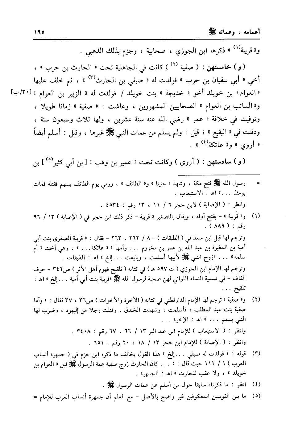 (و) خامستهن: (صفية «2» ) كانت في الجاهلية تحت «الحارث بن حرب» ، أخي «أبي سفيان بن حرب» فولدت له «صيفي بن الحارث «3» » ، ثم خلف عليها «العوام» بن خويلد أخو «خديجة» بنت خويلد/ فولدت له «الزبير بن العوام» و «السائب بن العوام» الصحابيين المشهورين، وعاشت: «صفية» زمانا طويلا، وتوفيت في خلافة «عمر» رضي الله عنه سنة عشرين، ولها ثلاث وسبعون سنة، ودفنت في «البقيع» ؛ قيل: ولم يسلم من عمات النبي صلى الله عليه وسلّم غيرها، وقيل: أسلم أيضا «أروي» و «عاتكة «4» » .