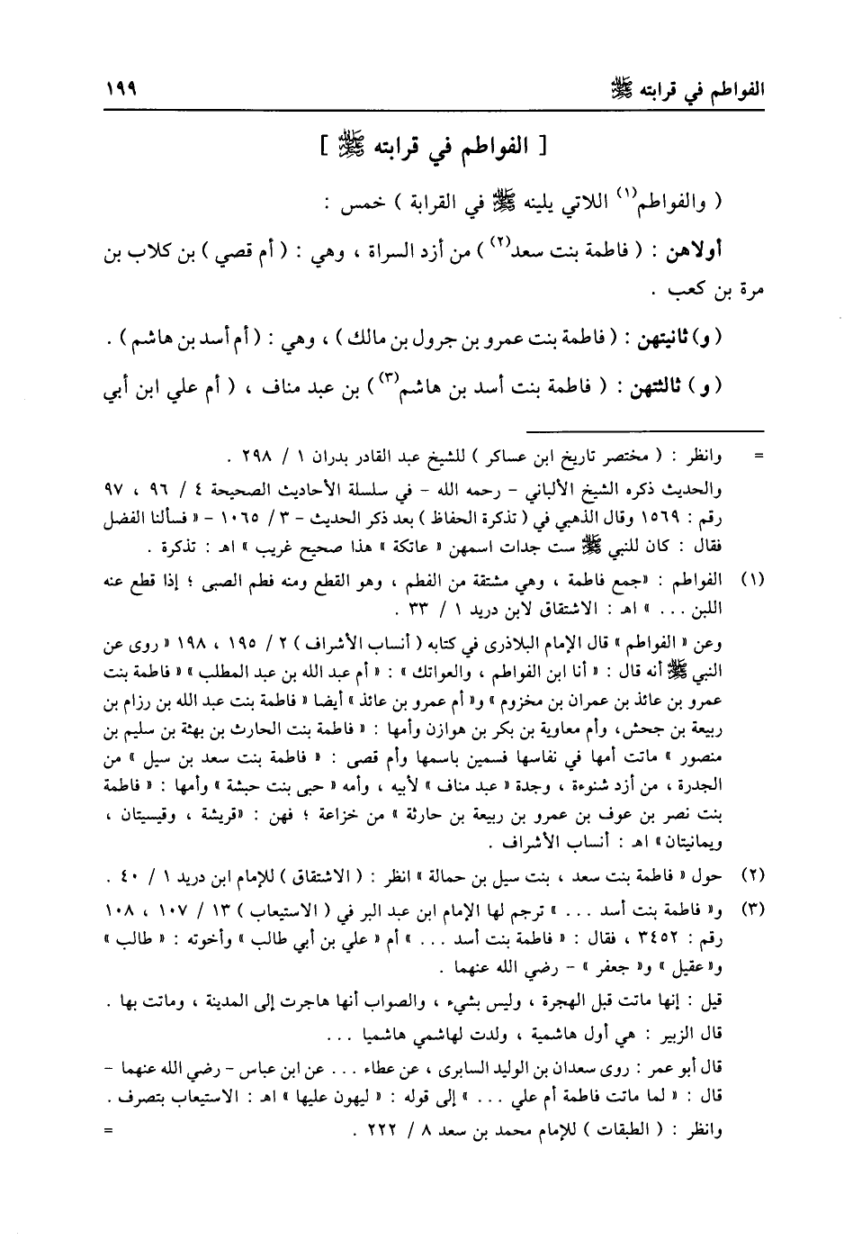 (1) الفواطم: «جمع فاطمة، وهي مشتقة من الفطم، وهو القطع ومنه فطم الصبى؛ إذا قطع عنه اللبن ... » اه: الاشتقاق لابن دريد 1/ 33. وعن «الفواطم» قال الإمام البلاذري في كتابه (أنساب الأشراف) 2/ 195، 198 «روى عن النبي صلى الله عليه وسلّم أنه قال: «أنا ابن الفواطم، والعواتك» : «أم عبد الله بن عبد المطلب» «فاطمة بنت عمرو بن عائذ بن عمران بن مخزوم» و «أم عمرو بن عائذ» أيضا «فاطمة بنت عبد الله بن رزام بن ربيعة بن جحش، وأم معاوية بن بكر بن هوازن وأمها: «فاطمة بنت الحارث بن بهثة بن سليم بن منصور» ماتت أمها في نفاسها فسمين باسمها وأم قصى: «فاطمة بنت سعد بن سيل» من الجدرة، من أزد شنوءة، وجدة «عبد مناف» لأبيه، وأمه «حبى بنت حبشة» وأمها: «فاطمة بنت نصر بن عوف بن عمرو بن ربيعة بن حارثة» من خزاعة؛ فهن: «قريشة، وقيسيتان، ويمانيتان» اه: أنساب الأشراف.