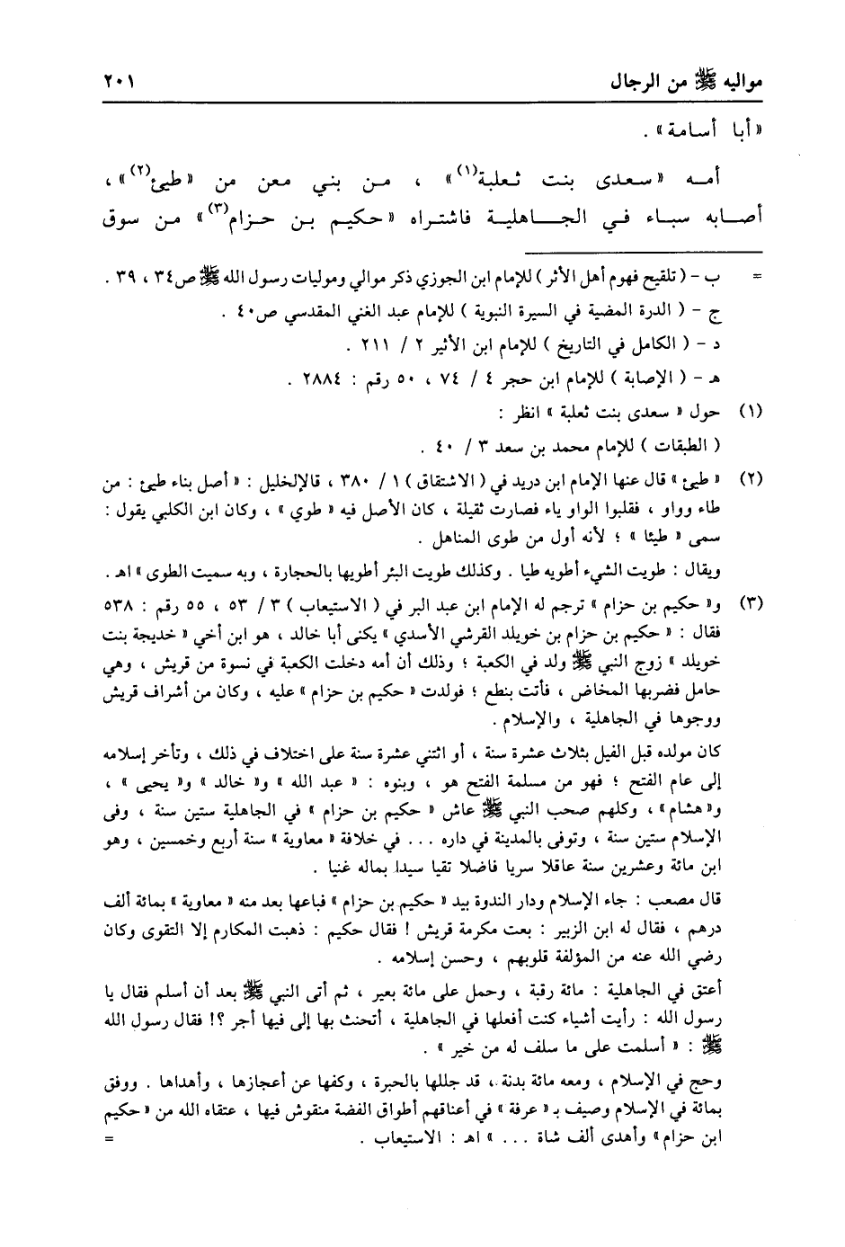 - ب- (تلقيح فهوم أهل الأثر) للإمام ابن الجوزي ذكر موالي وموليات رسول الله صلى الله عليه وسلّم ص 34، 39. ج- (الدرة المضية في السيرة النبوية) للإمام عبد الغني المقدسي ص 40. د- (الكامل في التاريخ) للإمام ابن الأثير 2/ 211. هـ- (الإصابة) للإمام ابن حجر 4/ 74، 50 رقم: 2884.