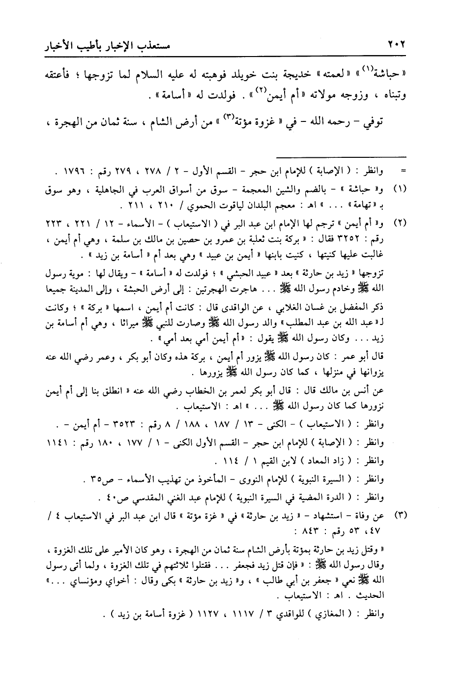 (2) و «أم أيمن» ترجم لها الإمام ابن عبد البر في (الاستيعاب) - الأسماء- 12/ 221، 223 رقم: 3252 فقال: «بركة بنت ثعلبة بن عمرو بن حصين بن مالك بن سلمة، وهي أم أيمن، غالبت عليها كنيتها، كنيت بابنها «أيمن بن عبيد» وهي بعد أم «أسامة بن زيد» . تزوجها «زيد بن حارثة» بعد «عبيد الحبشي» ؛ فولدت له «أسامة» - ويقال لها: موية رسول الله صلى الله عليه وسلّم وخادم رسول الله صلى الله عليه وسلّم ... هاجرت الهجرتين: إلى أرض الحبشة، وإلى المدينة جميعا ذكر المفضل بن غسان الغلابي، عن الواقدى قال: كانت أم أيمن، اسمها «بركة» ؛ وكانت ل «عبد الله بن عبد المطلب» والد رسول الله صلى الله عليه وسلّم وصارت للنبي صلى الله عليه وسلّم ميراثا، وهي أم أسامة بن زيد ... وكان رسول الله صلى الله عليه وسلّم يقول: «أم أيمن أمي بعد أمي» . قال أبو عمر: كان رسول الله صلى الله عليه وسلّم يزور أم أيمن، بركة هذه وكان أبو بكر، وعمر رضي الله عنه يزوانها في منزلها، كما كان رسول الله صلى الله عليه وسلّم يزورها. عن أنس بن مالك قال: قال أبو بكر لعمر بن الخطاب رضي الله عنه «انطلق بنا إلى أم أيمن نزورها كما كان رسول الله صلى الله عليه وسلّم ... » اه: الاستيعاب. وانظر: (الاستيعاب) - الكنى- 13/ 187، 188/ 8 رقم: 3523- أم أيمن-. وانظر: (الإصابة) للإمام ابن حجر- القسم الأول الكنى- 1/ 177، 180 رقم: 1141. وانظر: (زاد المعاد) لابن القيم 1/ 114. وانظر: (السيرة النبوية) للإمام النووى- المأخوذ من تهذيب الأسماء- ص 35. وانظر: (الدرة المضية في السيرة النبوية) للإمام عبد الغني المقدسي ص 40.